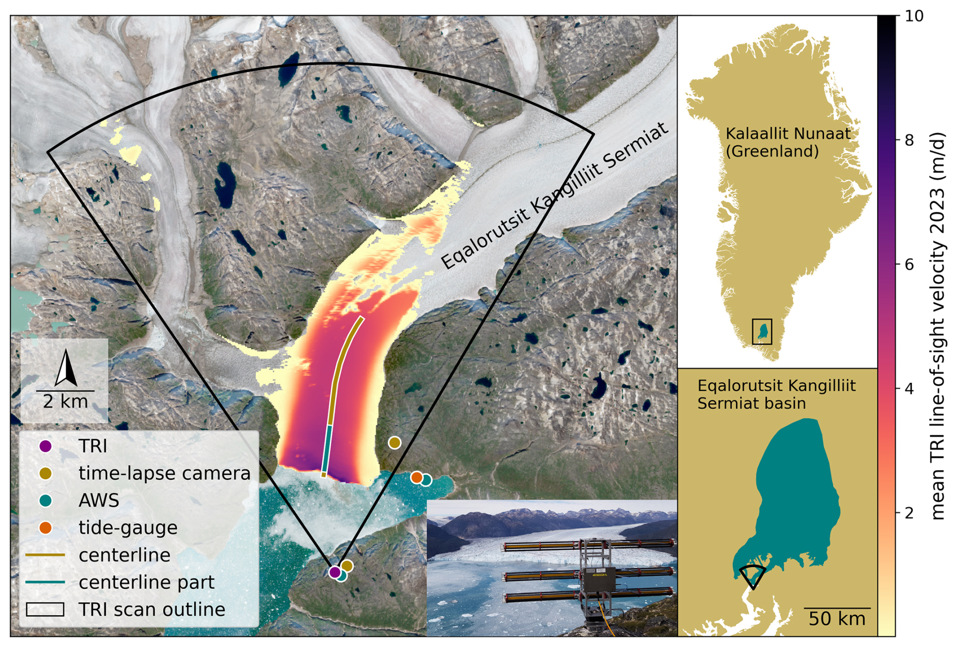 Figure 1Overview Sentinel-2 image (Copernicus Data Space Ecosystem, 2025) showing the terminus region of the tidewater glacier Eqalorutsit Kangilliit Sermiat (EKaS). Superimposed is the mean line-of-sight velocity field derived from the terrestrial radar interferometer (TRI) for the period 3–15 August 2023. The sensor locations of TRI, time-lapse cameras, automatic weather station (AWS) and the tide-gauge are marked. The picture on the lower right shows the established TRI during the measurement period. The two inset graphs on the right illustrate the position of the EKaS glacier system within the Greenland ice sheet (Mouginot and Rignot, 2019).