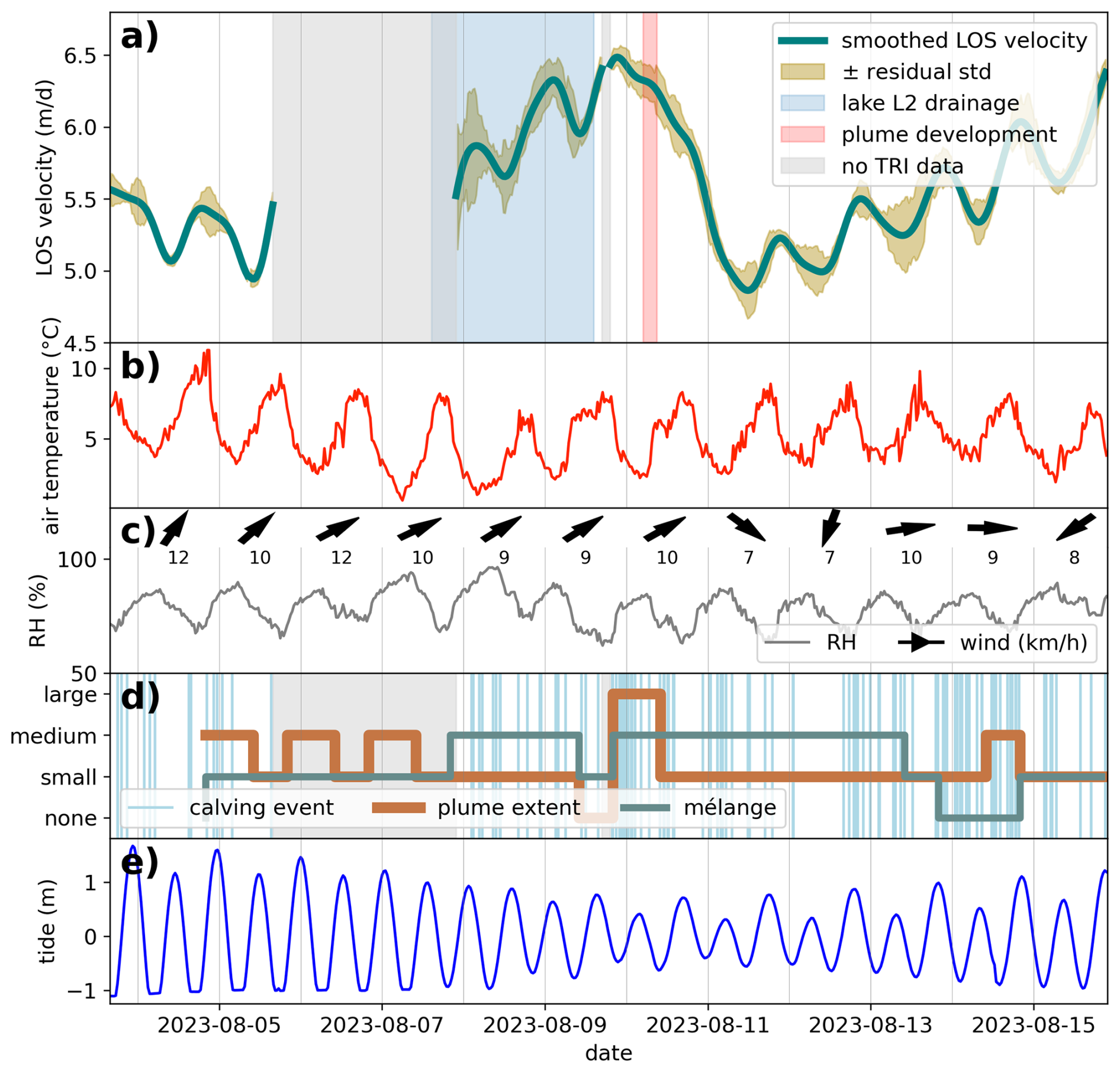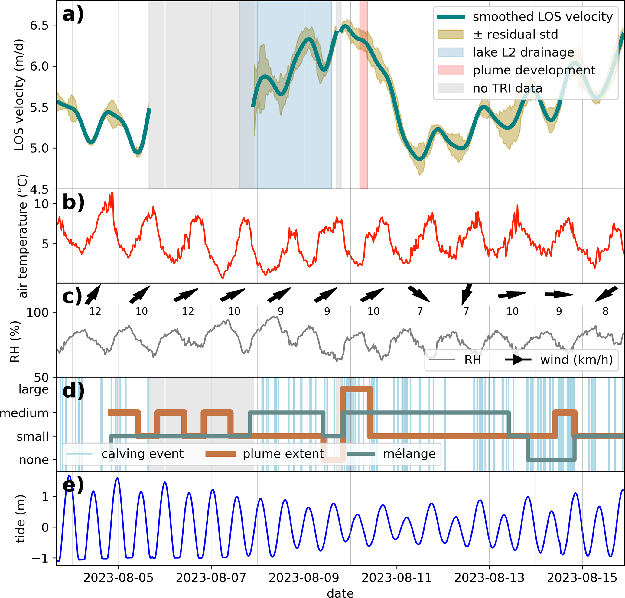 Figure 2(a) Low-pass-filtered line-of-sight (LOS) mean centreline velocity of the summer campaign 2023 (green) together with ± 1 standard deviation of the residuals computed over a 3 h window (gold). (b) Air temperature, (c) relative humidity (RH) and wind records from nearby weather stations. (d) Categorical time-series of ice mélange and plume extent are retrieved from time-lapse imagery, and calving events (> 5000 m3) detected by TRI. (e) Tidal amplitude from tide-gauge.