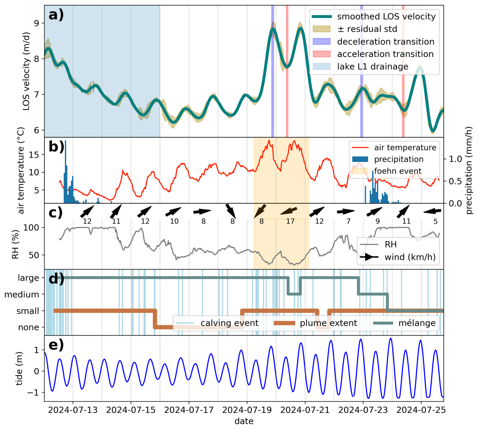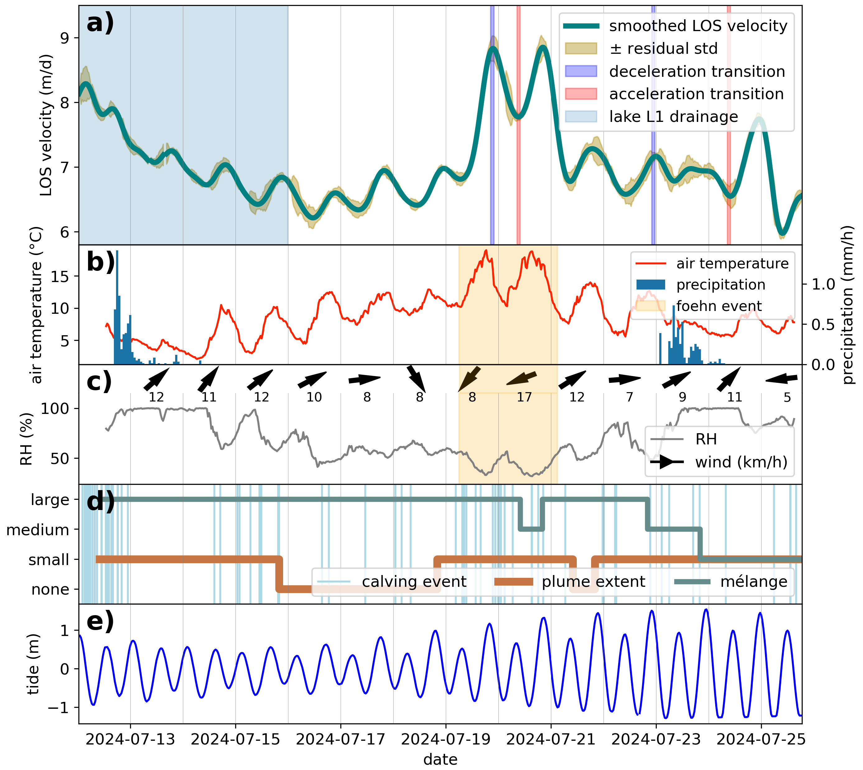Figure 3(a) Low-pass-filtered line-of-sight (LOS) mean centreline velocity of the summer campaign 2024 (green) together with ± 1 standard deviation of the residuals computed over a 3 h window (gold). (b) Air temperature and precipitation, as well as (c) relative humidity (RH) and wind records from nearby weather stations. (d) Categorical time-series of ice mélange and plume extent are retrieved from time-lapse imagery, and calving events (> 5000 m3) detected by TRI. (e) Tidal amplitude from tide-gauge.
