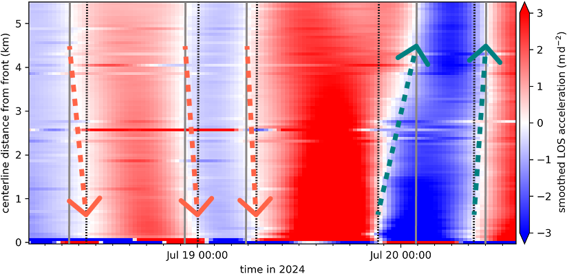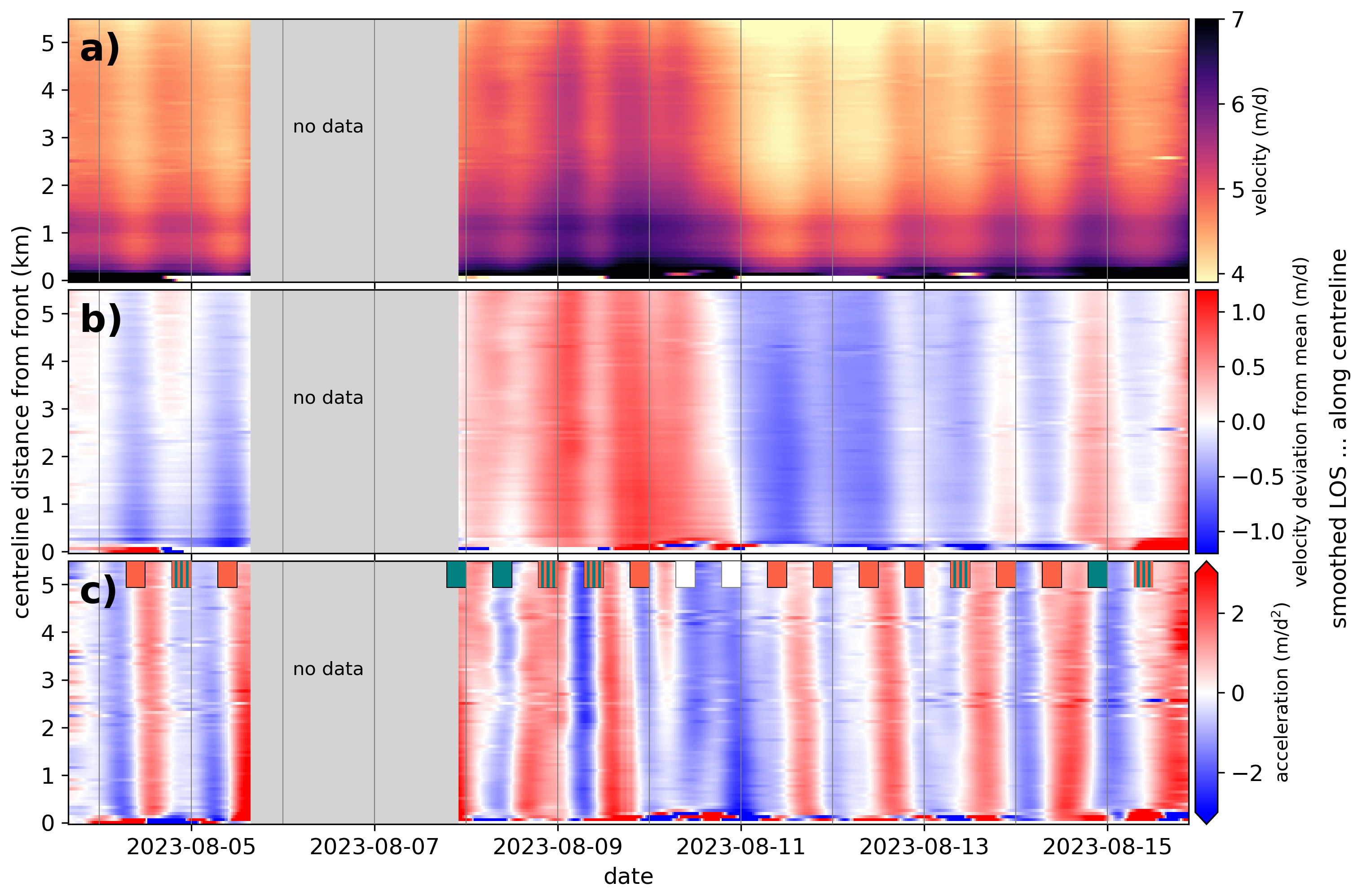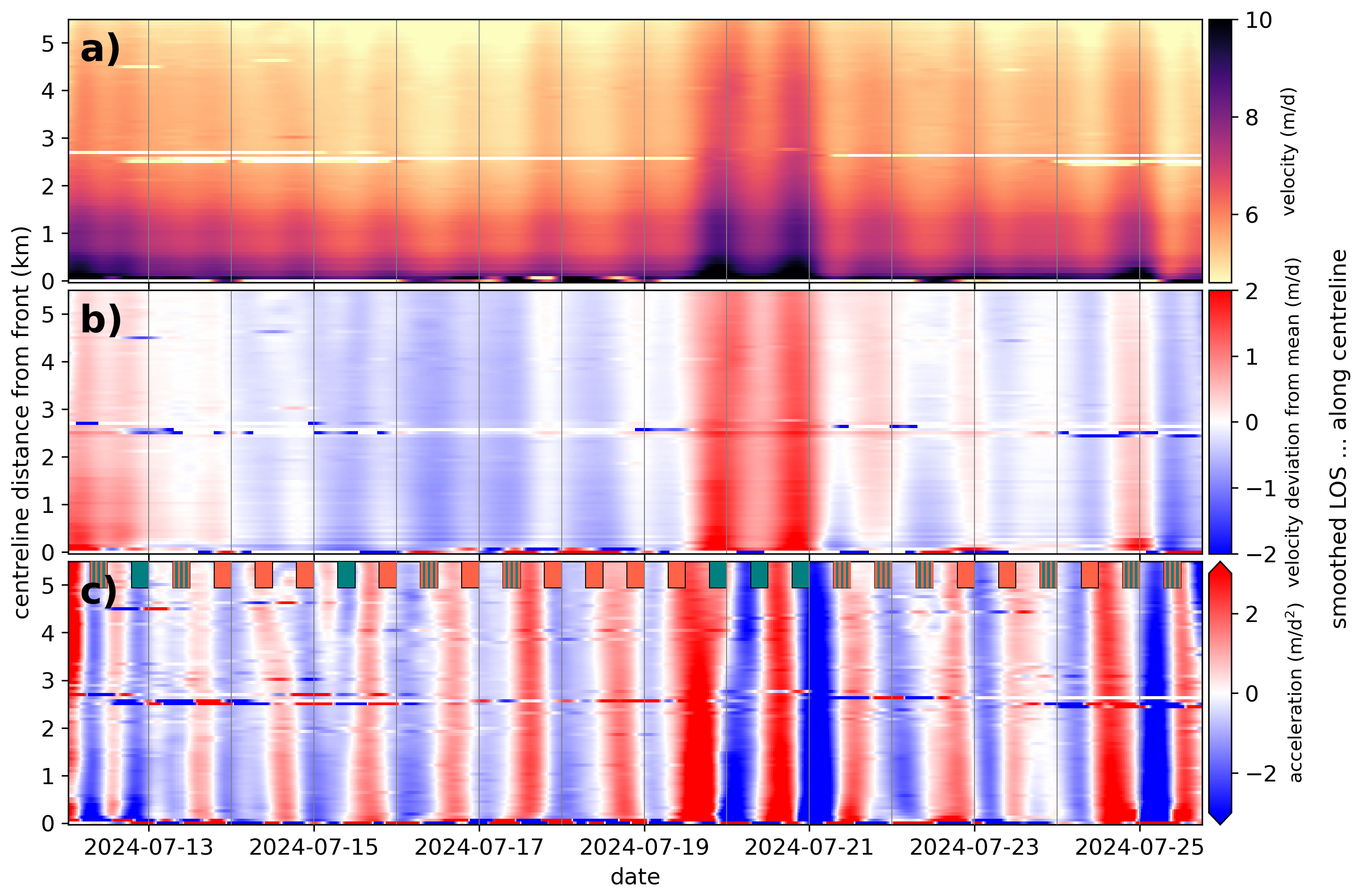 Figure 4(a) Smoothed 2023 LOS velocities along centreline and with time, (b) their deviations from the 2-week row average in 2023 along centreline and with time, (c) smoothed LOS acceleration along centreline and with time. The centreline spans from 100 m behind the calving front to about 5.5 km upstream. The coloured boxes label the along glacier propagation direction of the acceleration transitions, with green for upstream and orange for downstream. Orange-green striped transitions refer to either no clear propagation direction or a combination of an upstream and a downstream signal. White boxes represent no transition (deceleration only).