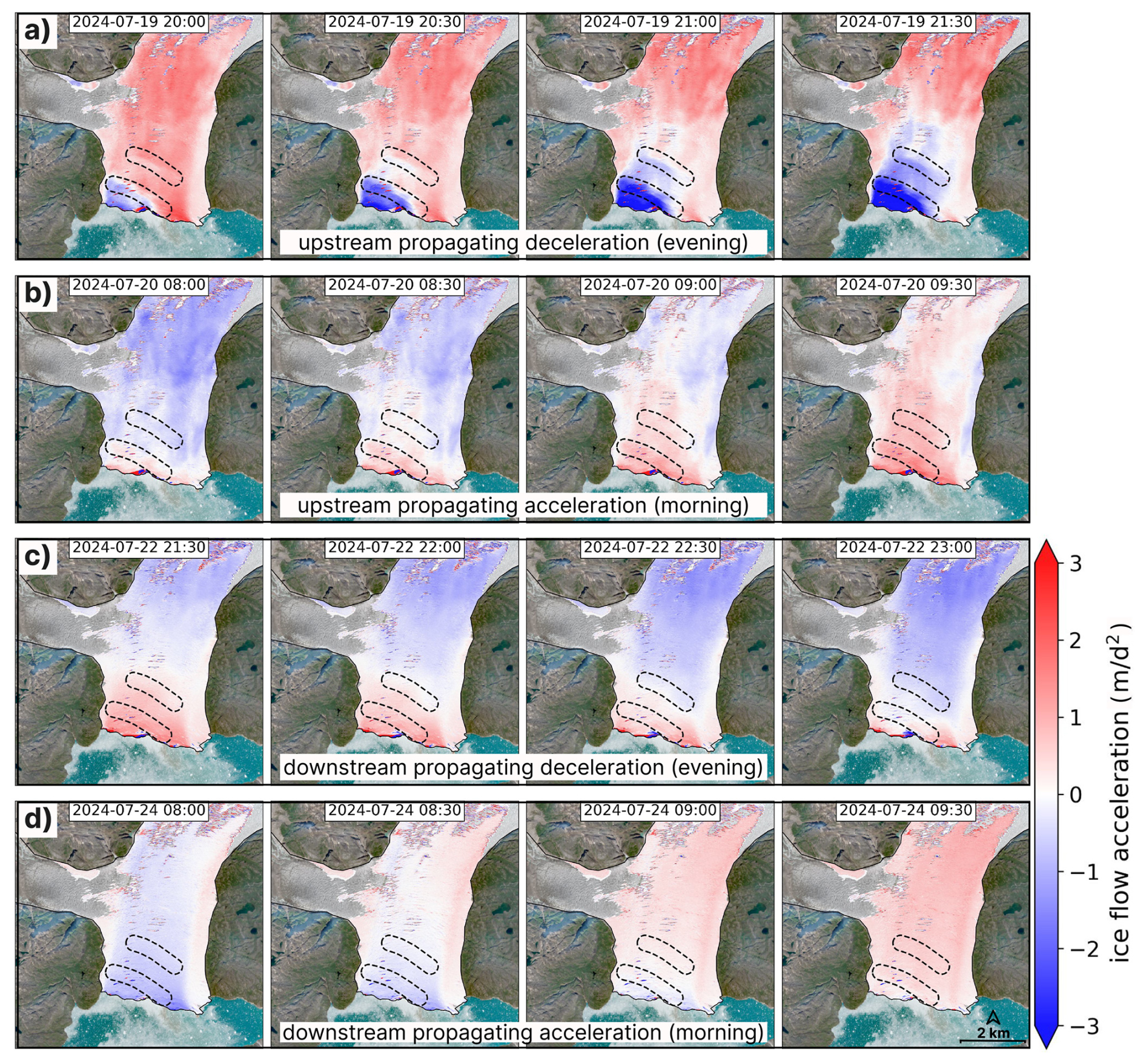 Figure 6Map sequences of deceleration in the evening propagating (a) upstream or (c) down-stream, as well as acceleration in the morning propagating (b) upstream or (d) downstream. Each sequence covers a total period of 1.5 h with a time interval of 30 min (absolute time is given in local Greenlandic time). Black dashed polygons represent zones with major rifts (Fig. A9), potentially influencing the spatial acceleration signal on certain days (a and b). The background image is a Sentinel-2 acquisition from 7 August 2023 (Copernicus Data Space Ecosystem, 2025).