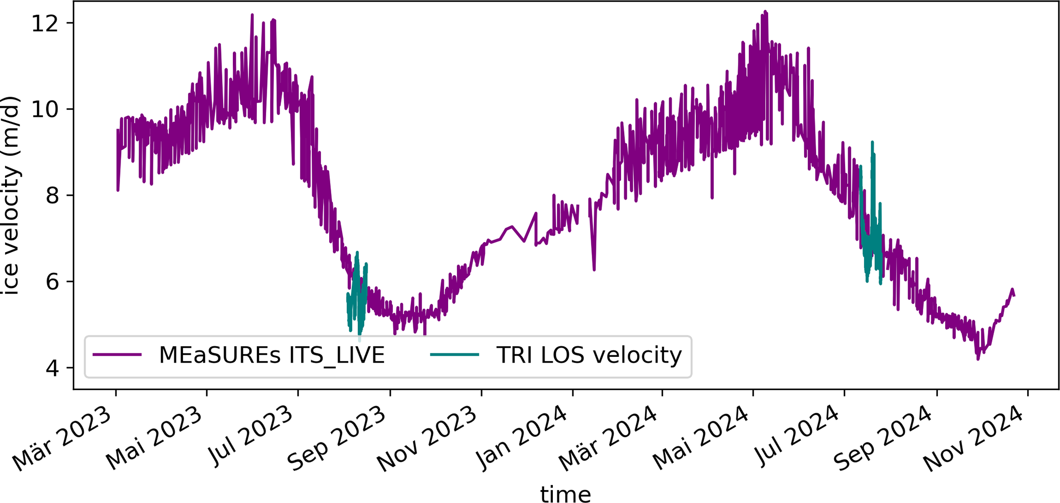 Figure 7Satellite-derived, year-round velocity estimates of EKaS' centreline by the NASA MEaSUREs ITS_LIVE dataset (purple, Gardner et al., 2023), highlighting the intra-annual velocity variations of EKaS. Additionally, the TRI time-series of the two field campaigns (green) indicate the measurement period within the annual cycle. Note, the data from TRI only captures the line-of-sight component of the velocity field.