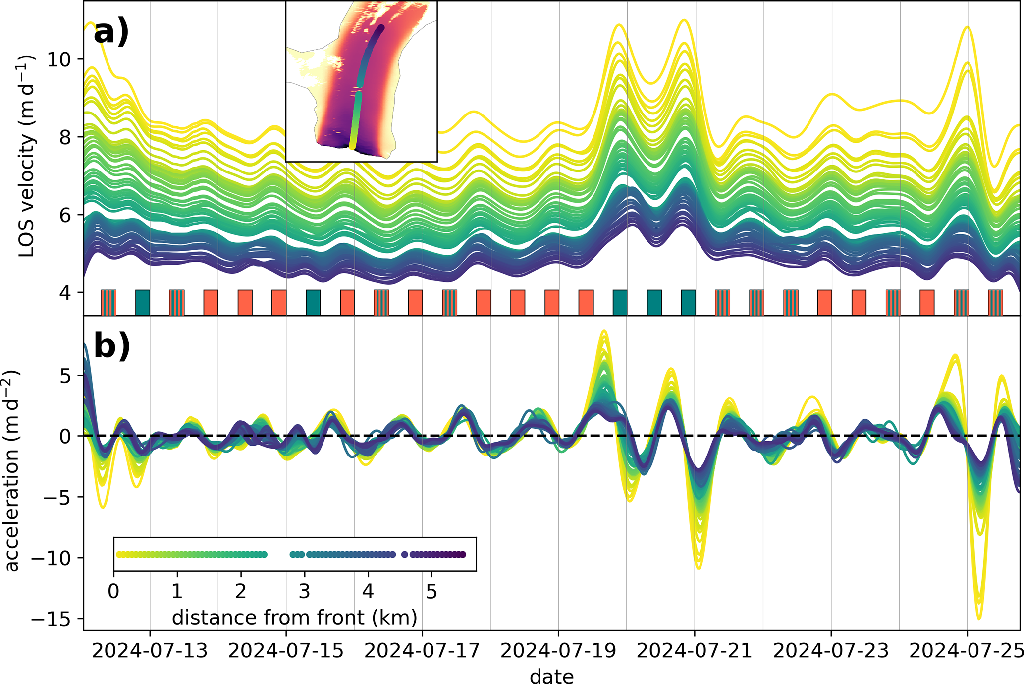 The temporal patterns, such as the diurnal and the multi-day speed-up events, can generally be observed almost uniformly along the entire 6 km long centreline (Figs. 4 and 5). The velocities are generally increasing towards the terminus (Figs. 4a and 5a). Subtracting the 2-week velocity average for each location indicates that the diurnal velocity fluctuations not only appear along the entire 6 km stretch, but also occur at a similar absolute magnitude along the centreline (Figs. 4b and 5b). This is further supported by comparing the average LOS velocity on three different flow and transverse lines, showing an almost constant velocity difference between these lines, regardless of any fluctuations, indicating a consistently detectable diurnal signal of similar magnitude at all distances from the terminus (Figs. A6 and A7).