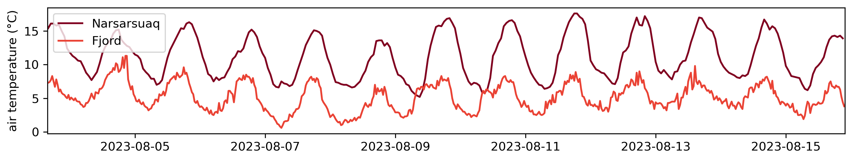 Figure A1Comparison of the air temperature record 2023 used in Fig. 2 from the “Fjord” weather station east of the terminus of EKaS to the Mittafik Airport weather station in Narsarsuaq operated by the Danish Meteorological Institute (Drost Jensen, 2023).