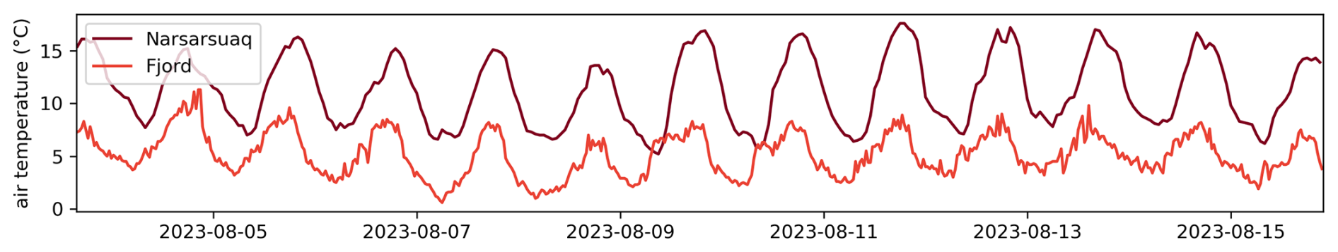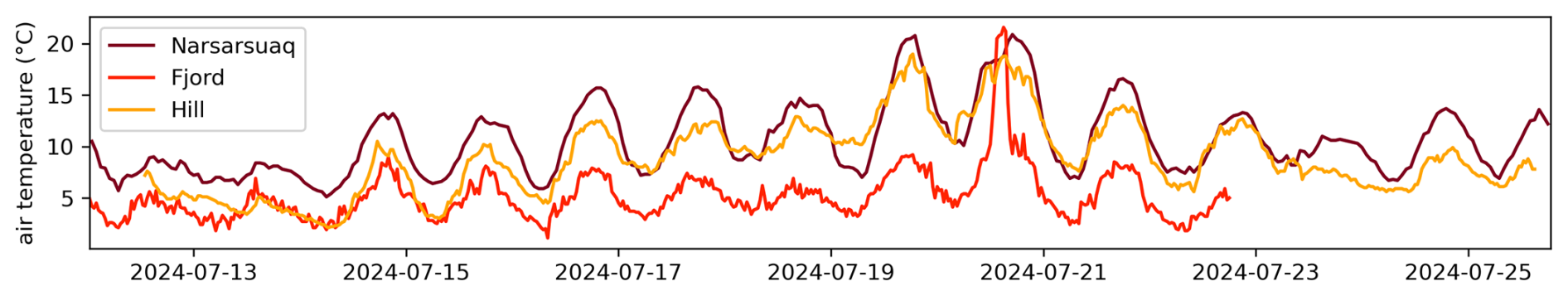 In 2023, we installed a basic automatic weather station (AWS) near the shore east of the terminus of EKaS (called “Fjord”, data used in Fig. 2b). One year later, a weather station was deployed next to the TRI, on the hill on the opposite side of the glacier terminus, 500 m above sea level (called “Hill”, data used in Fig. 3b). Both weather stations were measuring air temperature, relative humidity, incoming solar radiation, and precipitation at a 30 min interval. Wind speed and wind direction were taken from the Mittafik Airport weather station in Narsarsuaq (Drost Jensen, 2023). This weather station, operated by the Danish Meteorological Institute (DMI), is located about 20 km from the front of EKaS, in a valley that is aligned parallel to the flow direction of EKaS. Since different weather stations were used to derive the air-temperature records for the two years, we compared both datasets with the AWS at Narsarsuaq to ensure that they reflect regional temperature variability rather than site-specific effects (e.g. temperature inversions). As shown in Figs. A1 and A2, the regional temperature signal is well captured in both cases. The only exception is the initial phase of the foehn event on 20 July 2024, which was suppressed at the “Fjord” station by a local inversion. Therefore, data from the “Hill” station were used in 2024.