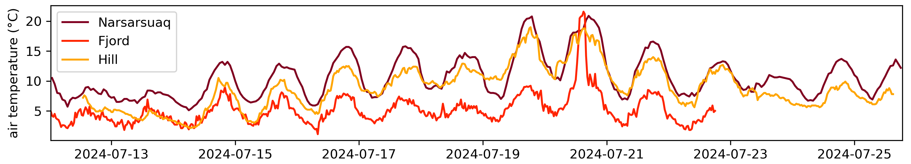 Figure A2Comparison of the air temperature record 2024 used in Fig. 3 from the “Hill” weather station at the hill on the opposite side of the glacier terminus to the AWS at the “Fjord” weather station east of the terminus of EKaS and to the Mittafik Airport weather station in Narsarsuaq operated by the Danish Meteorological Institute (Drost Jensen, 2023). Note that parts of the fjord temperature signal is suppressed by local inversion effects.