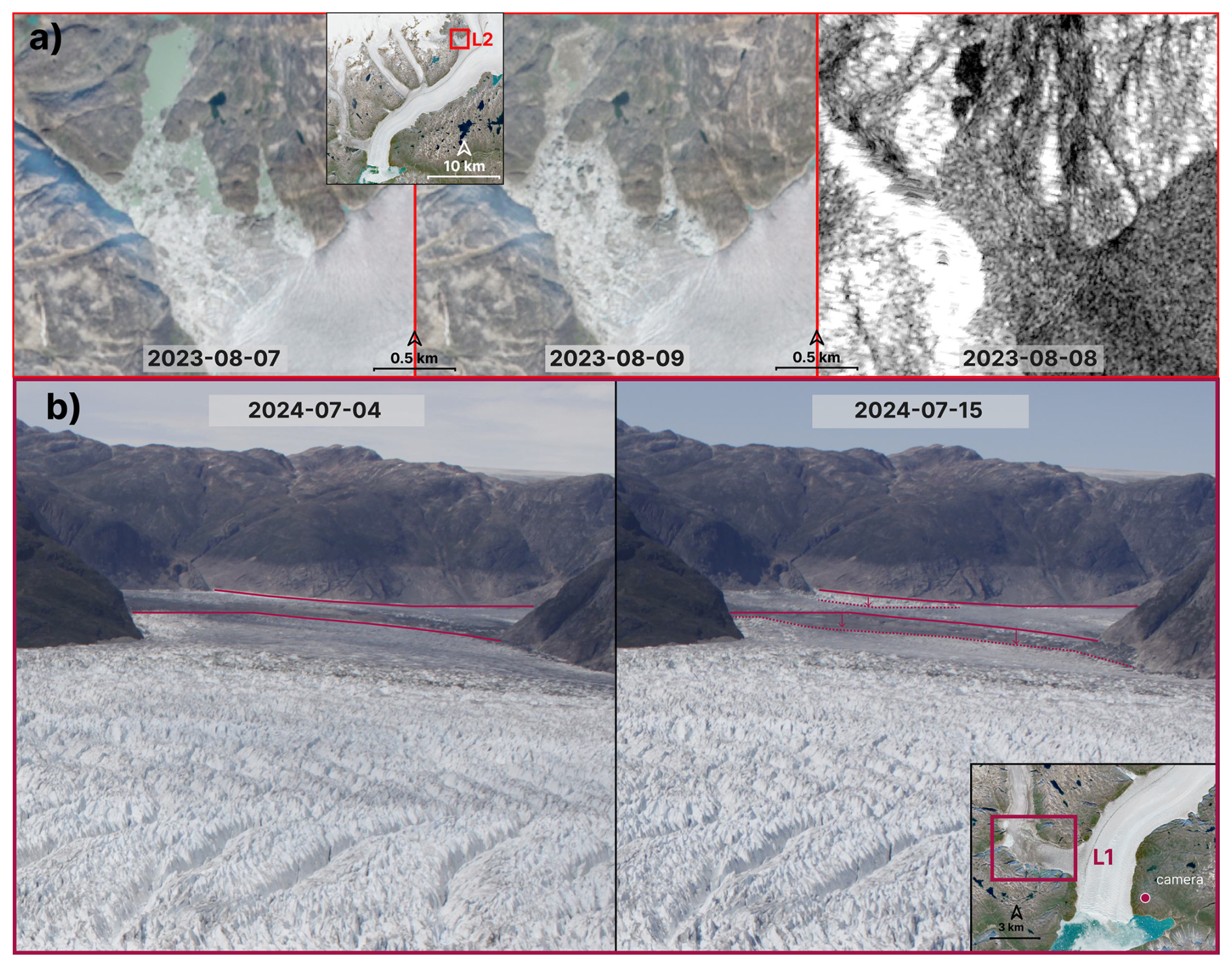 Figure A3(a) Sentinel-2 and Sentinel-1 imagery before, after and during the ice-marginal lake drainage event L2 (red) occurring between 7–9 August 2023, about 20 km upstream of the terminus (Copernicus Data Space Ecosystem, 2025). (b) Time-lapse imagery before and after the subglacial lake discharge event between 4–15 July 2024. The Sentinel-2 inset maps from 7 August 2023 show the locations of the lakes and the camera (Copernicus Data Space Ecosystem, 2025).