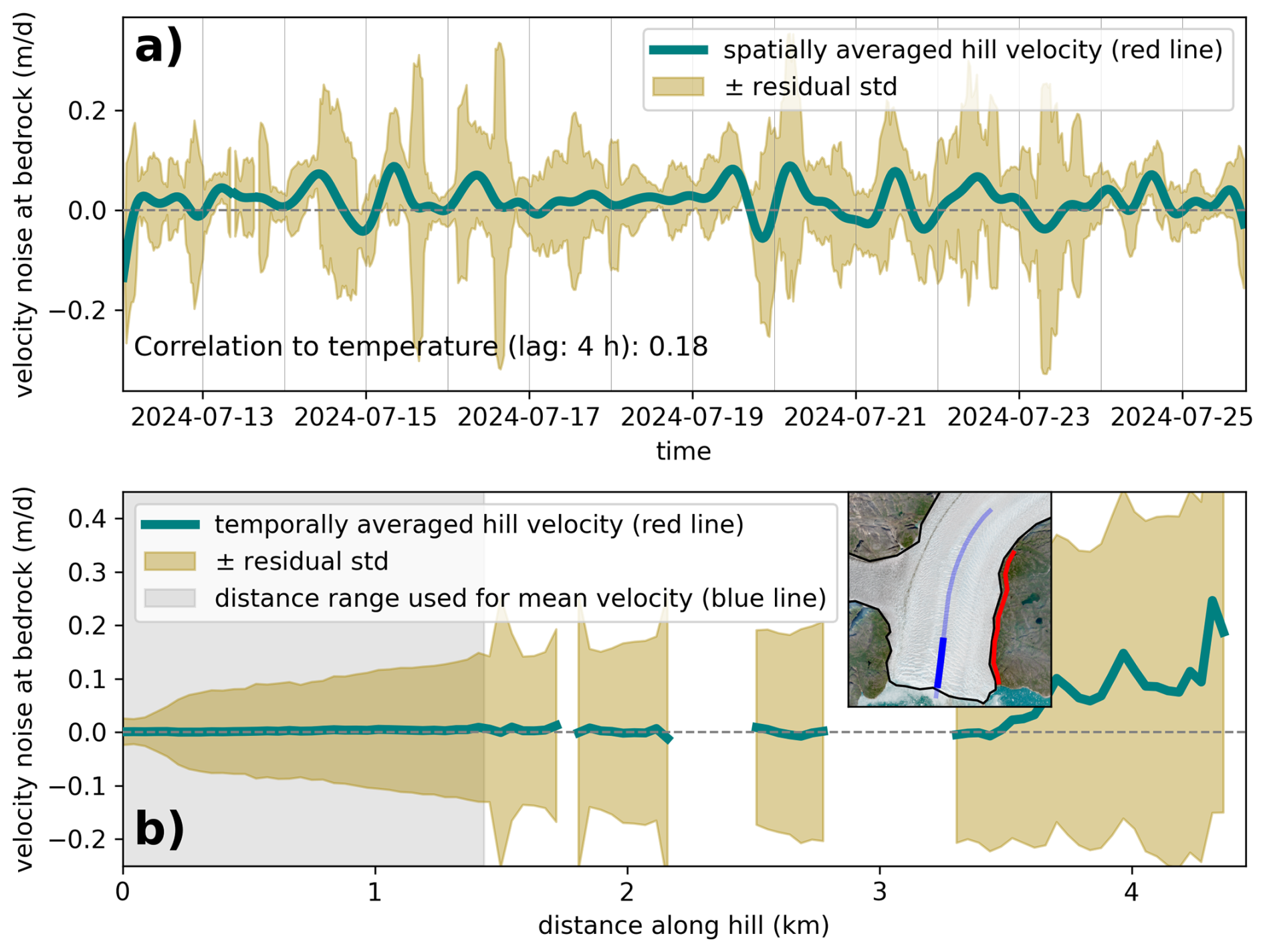 Figure A4Temporal (a) and spatial (b) velocity estimates over exposed bedrock along the glacier (red line) to assess data quality. The LOS velocity at the bedrock is close to zero, in particular within the distance of the centreline part (bold blue line), which is used for the mean LOS velocity calculations. This highlights that the influence of sensor sensitivity on the diurnal and multi-day velocity signal is negligible. The image in the inset graph is a Sentinel-2 acquisition from 7 August 2023 (Copernicus Data Space Ecosystem, 2025).