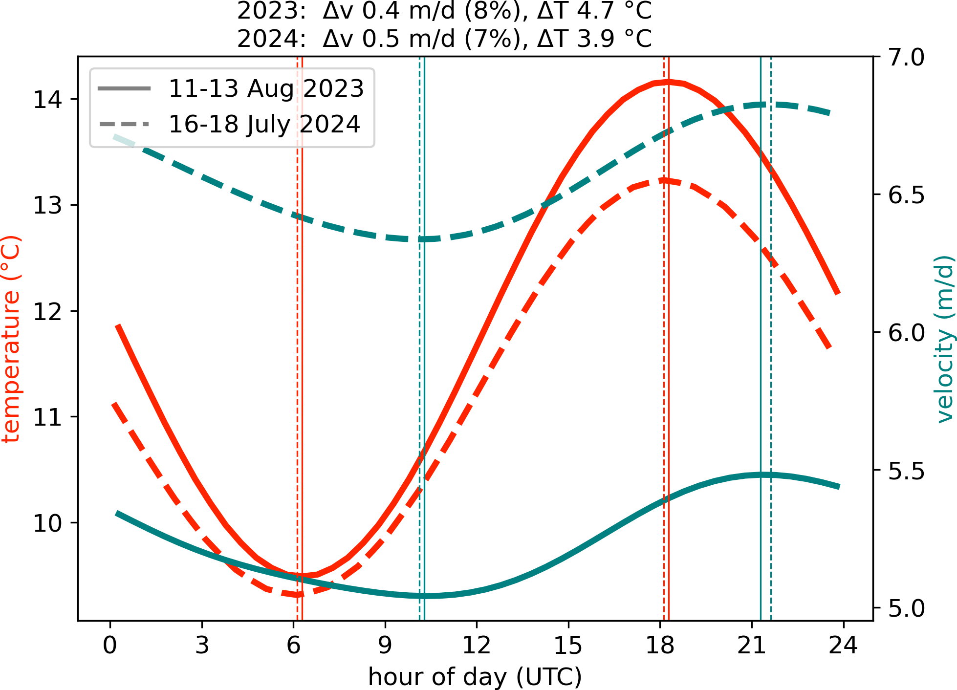 Figure A5Average diurnal temperature (red lines) and LOS velocity (green lines) cycle for 3 d periods that are not directly influenced by multi-day speed-up events (11–13 August 2023; 16–18 July 2024). For consistency between 2023 (solid lines) and 2024 (dashed lines), temperature records for both years are taken from the Mittafik Airport weather station in Narsarsuaq operated by the Danish Meteorological Institute (Drost Jensen, 2023). The vertical lines mark the time of the day (UTC) at which the daily maximum or minimum temperature and velocity occurs.