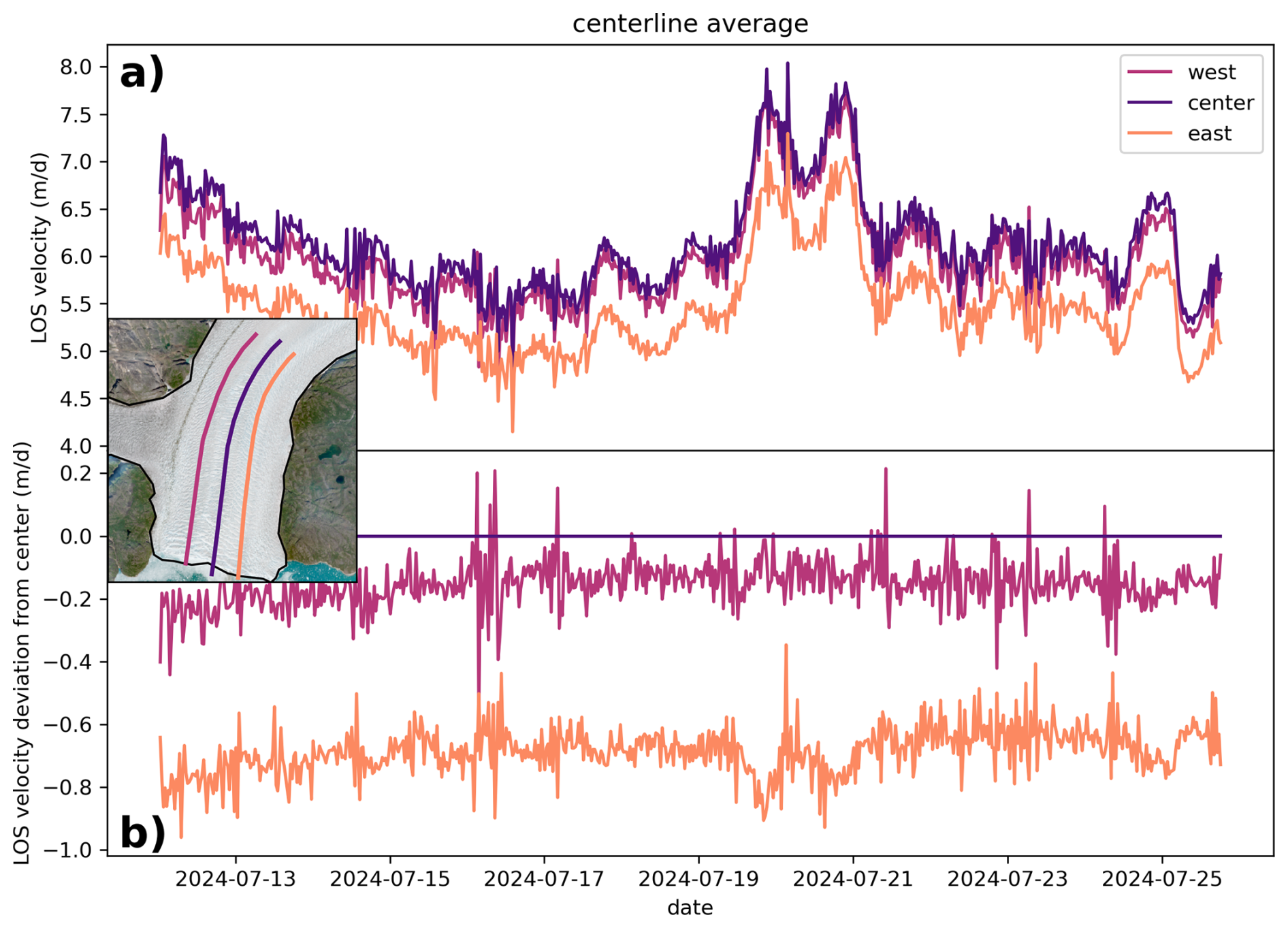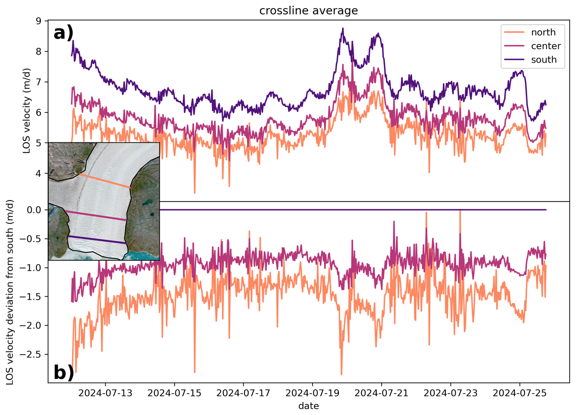 Figure A6(a) Average LOS velocity time-series in 2024 for three parallel flow lines and (b) their deviation from the central flow line highlighting the spatially constant diurnal velocity fluctuations. The image in the inset graph is a Sentinel-2 acquisition from 7 August 2023 (Copernicus Data Space Ecosystem, 2025).