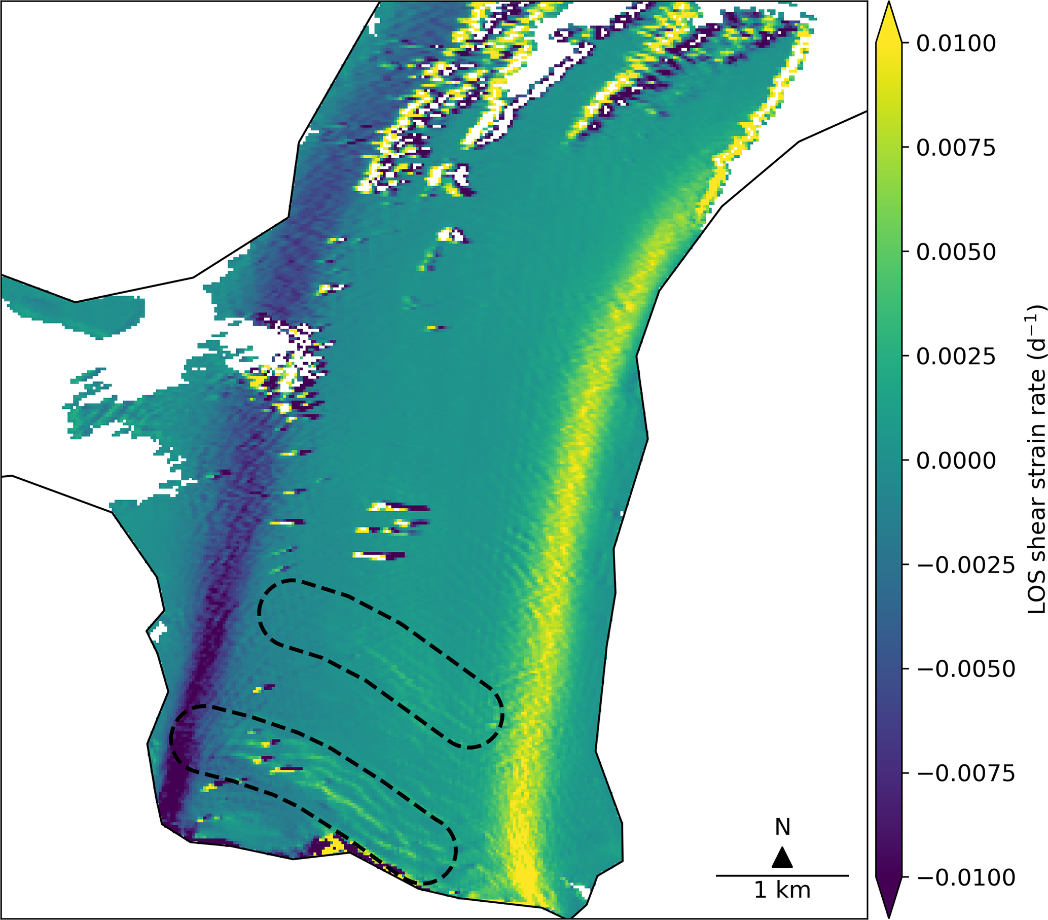 For the period of the observed main velocity speed-up event in the summer 2023 data, we observed an ice-marginal lake drainage event (L2, Fig. A3a), that may have provided a large volume of freshwater input to the glacier system. Satellite imagery from Sentinel-1 and Sentinel-2 (Copernicus Data Space Ecosystem, 2025) showed that the lake, which is located 20 km upstream at the orographic right margin of the main glacier, drained between 7–9 August (Fig. A3a). Sentinel-1 data indicates a half empty lake on the morning of 8 August and thus confirms ongoing drainage (Copernicus Data Space Ecosystem, 2025). Dømgaard et al. (2024) already observed this ice-marginal lake drainage in 2020 and 2022 and used satellite products to estimate an average water level drop of 12 m, which corresponds to about 2 million m3 of released water, considering a lake area of roughly 0.2 km2. Given an expected delay due to the large distance to the terminus, the lake drainage date seems to align with the high velocity speed-up event that peaks at the start of 10 August.