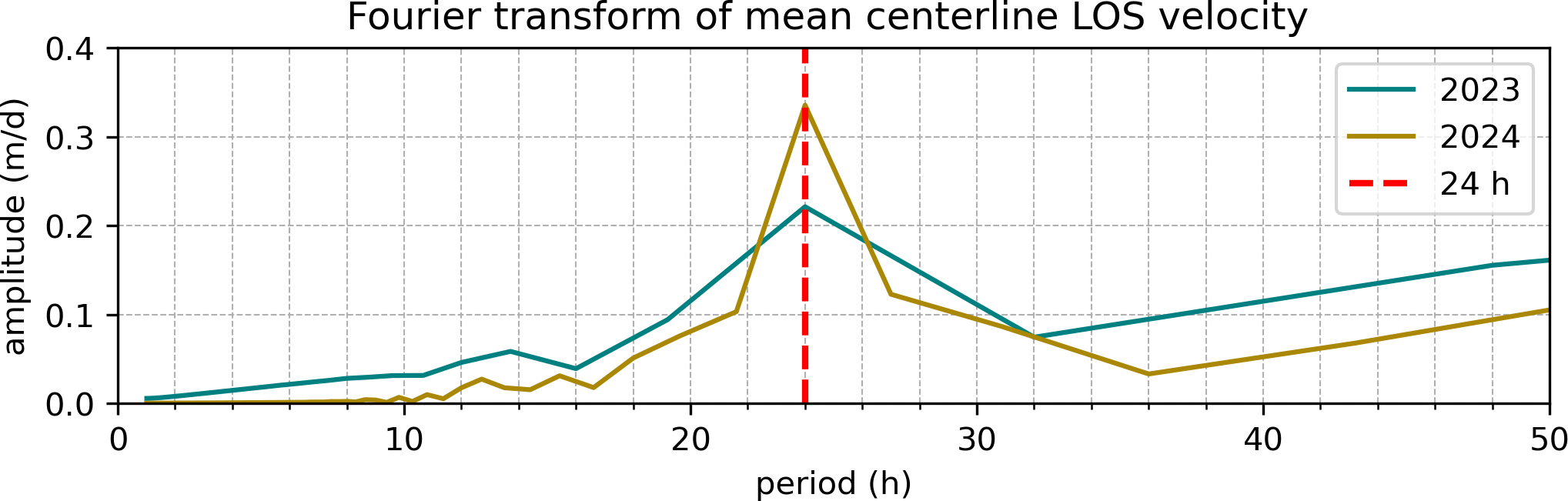 A Fourier analysis of the two velocity time series revealed strong peaks at 24 h for both years (Fig. A10). This suggests a clear solar influence rather than a lunar one, which lasts 12.4 h (Ross, 1995). Some studies find a (at least partial) link between flow speed and tidal forcing (e.g. Kane et al., 2020; Sugiyama et al., 2025). Our results, however, are in line with other studies that excluded tidal influences as a cause of diurnal velocity fluctuations (e.g. Davis et al., 2014; Pimentel et al., 2017; Stevens et al., 2022a). In particular, tidewater glaciers that are clearly grounded–such as EKaS–have been found to show no tidal response (Kneib-Walter et al., 2023).
