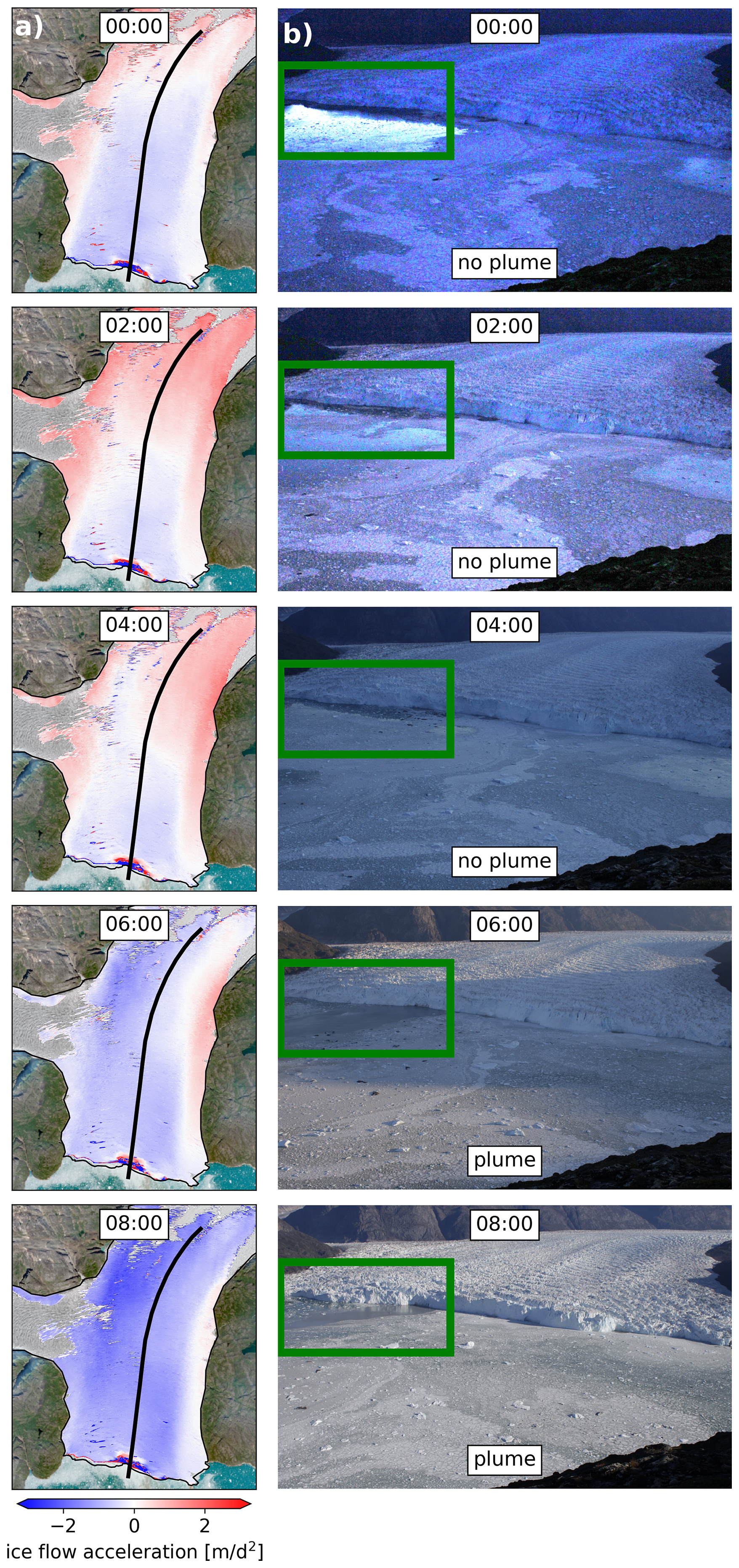 In 2024, cross-correlation analysis of the velocity and air temperature time-series reveals a peak correlation of 0.6 at a lag of 4 h, indicating a moderately positive relationship throughout the entire 2-week field period. In other words, the ice flow speed reaches its daily maximum 4 h after the temperature peak. For the days from 16 July 2024, onward, the correlation becomes even stronger, reaching a cross-correlation of 0.8, again at a lag of 4 h. However, before 16 July, no correlation between flow speed and air temperature can be detected, with a cross-correlation value < 0.1 at a lag of 4 h. Furthermore, the fjord was strongly covered by ice mélange, while the plume extent remained small for most of the time during the 2024 campaign (Fig. 3d).