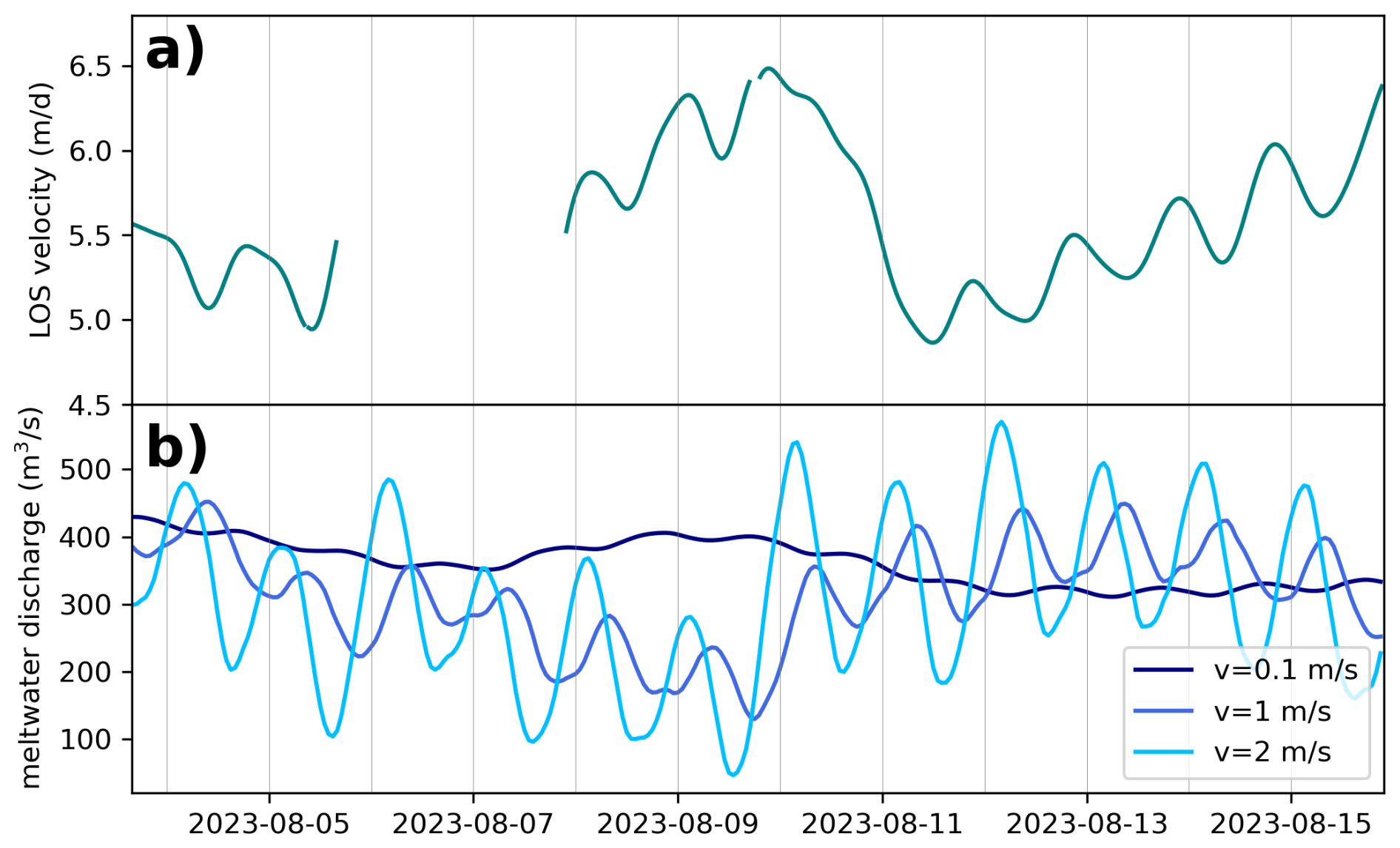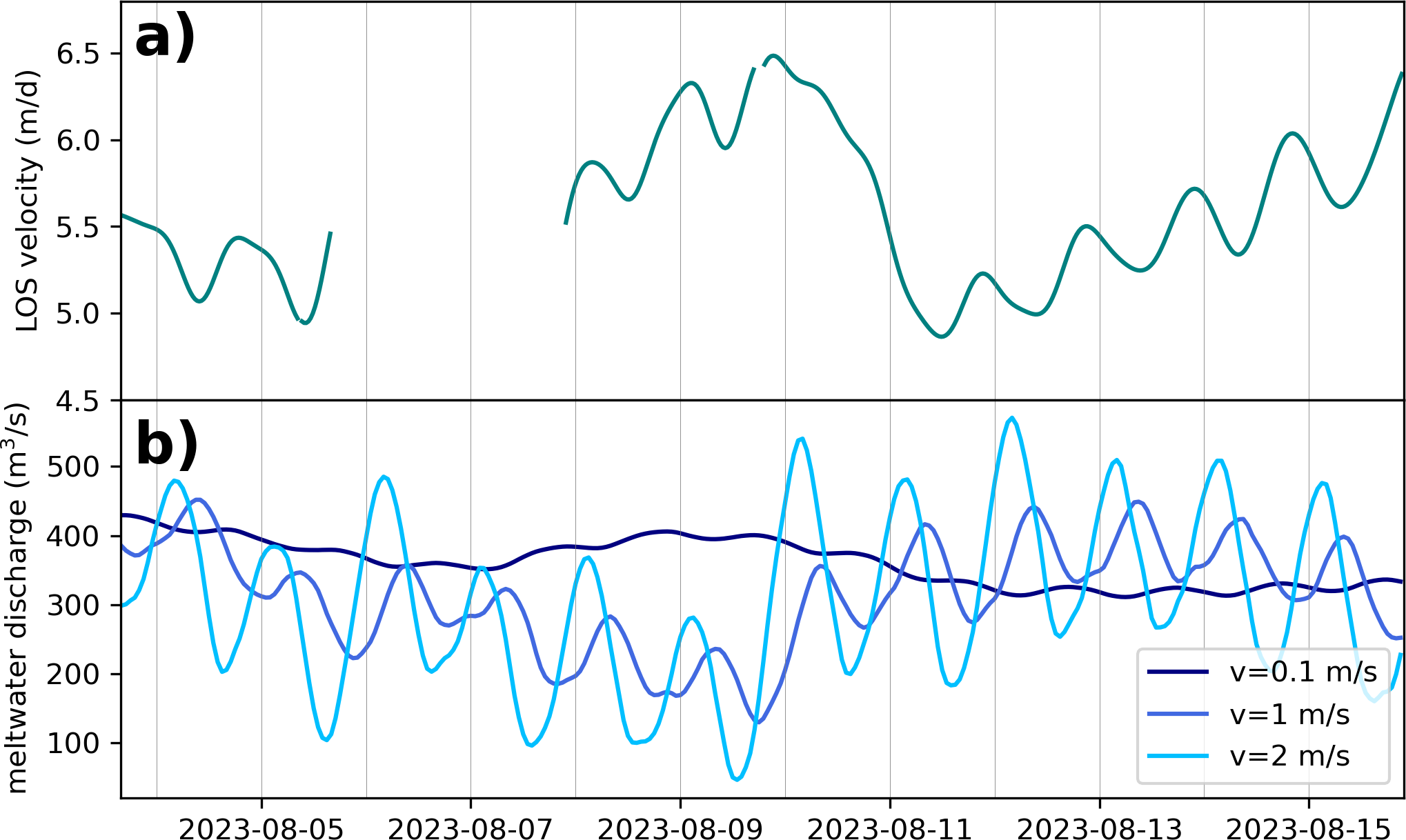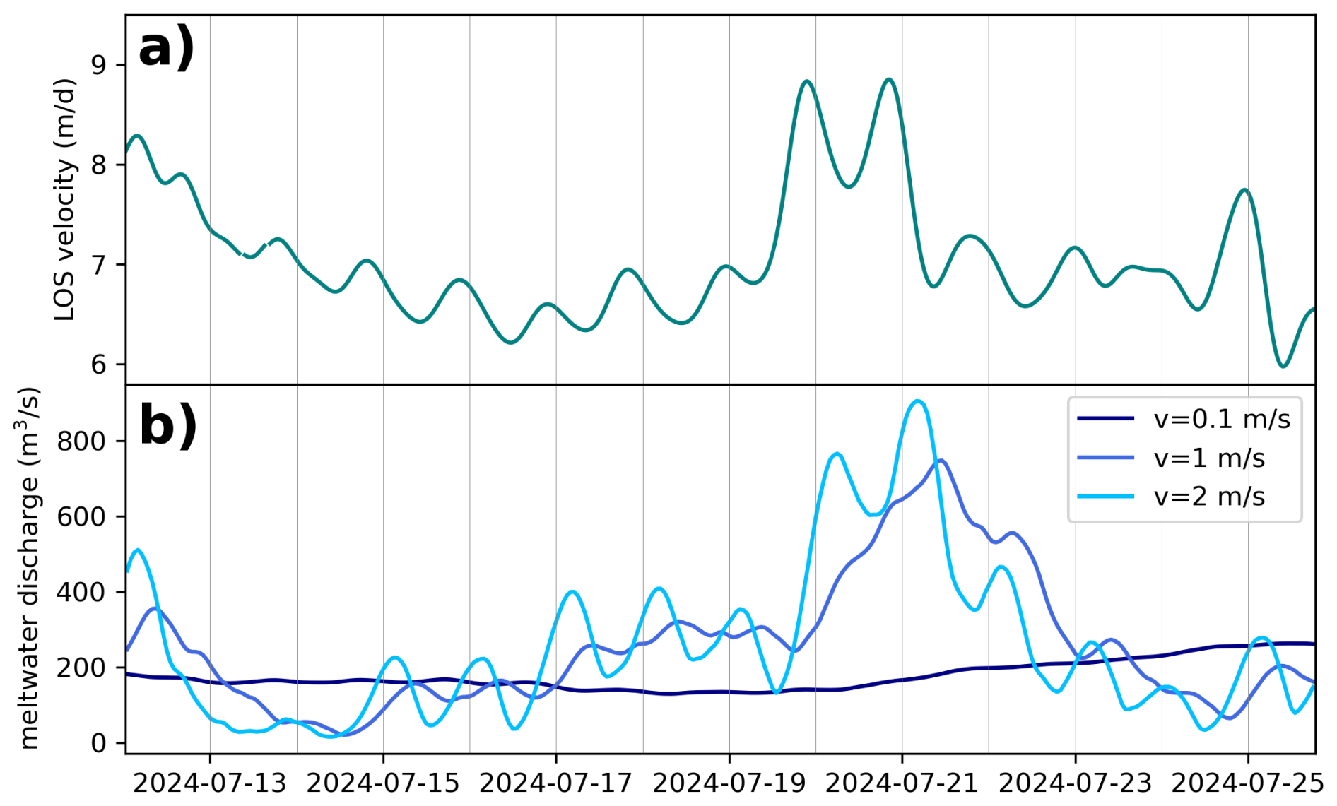 The peak velocity period around 10 August 2023, occurs during a time of constant, average melt conditions. However, other studies indicated that lake drainages, such as the L2 event, play an important role in forcing the evolution of an efficient subglacial drainage system and often align with the largest speed-up events (Sole et al., 2011). Subglacial discharge from the lake drainage event took about two days to cover the 20 km distance to the terminus. This estimate is based on the timing between the mid-emptying phase observed in Sentinel-1 imagery (Fig. A3) and the increased plume activity at the terminus. This results in an average discharge speed of approximately 0.1 m s−1, which is in good agreement with estimates of down-glacier flood propagation velocities of 0.01–0.1 m s−1 from previous studies for tidewater glaciers (e.g. Vieli et al., 2004; Stevens et al., 2022b; Wehrlé et al., 2025).