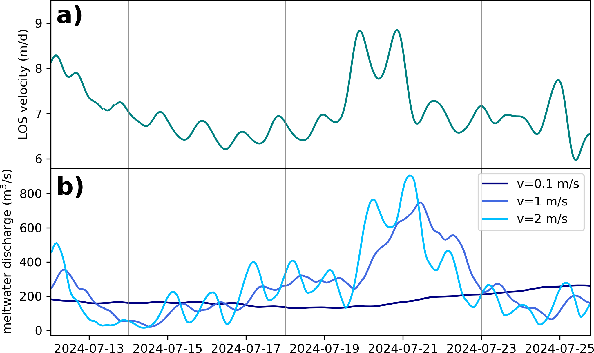 Over the past few decades, global warming has caused the Greenland ice sheet (GrIS) to lose mass at an increasing rate (Mankoff et al., 2021; Otosaka et al., 2023), making it one of the largest contributors to global sea level rise (Bamber et al., 2019; Shepherd et al., 2020; Zemp et al., 2025). About two-thirds of this mass loss between 1972 and 2018 is attributed to glacier dynamics of marine-terminating glaciers (Mouginot et al., 2019). Yet, the coupling between meltwater input, subglacial hydrology, and flow velocity that governs these processes is complex and remains poorly constrained, in particular across different timescales. Several studies suggest that warmer temperatures in the future, and the associated increase in surface melt, lead to enhanced mass loss through accelerated dynamic thinning (e.g. Parizek and Alley, 2004; Pritchard et al., 2009). However, other studies indicate that this relationship is not universally applicable (e.g. Tedstone et al., 2015; de Fleurian et al., 2022), since not the average melt but rather the melt variability influences increased flow velocities (Schoof, 2010). Consequently, it is crucial to understand the small-scale flow variations at the trunks of the marine-terminating outlet glaciers, with short-term velocity observations being a key constraint for such analysis.