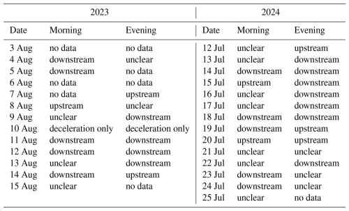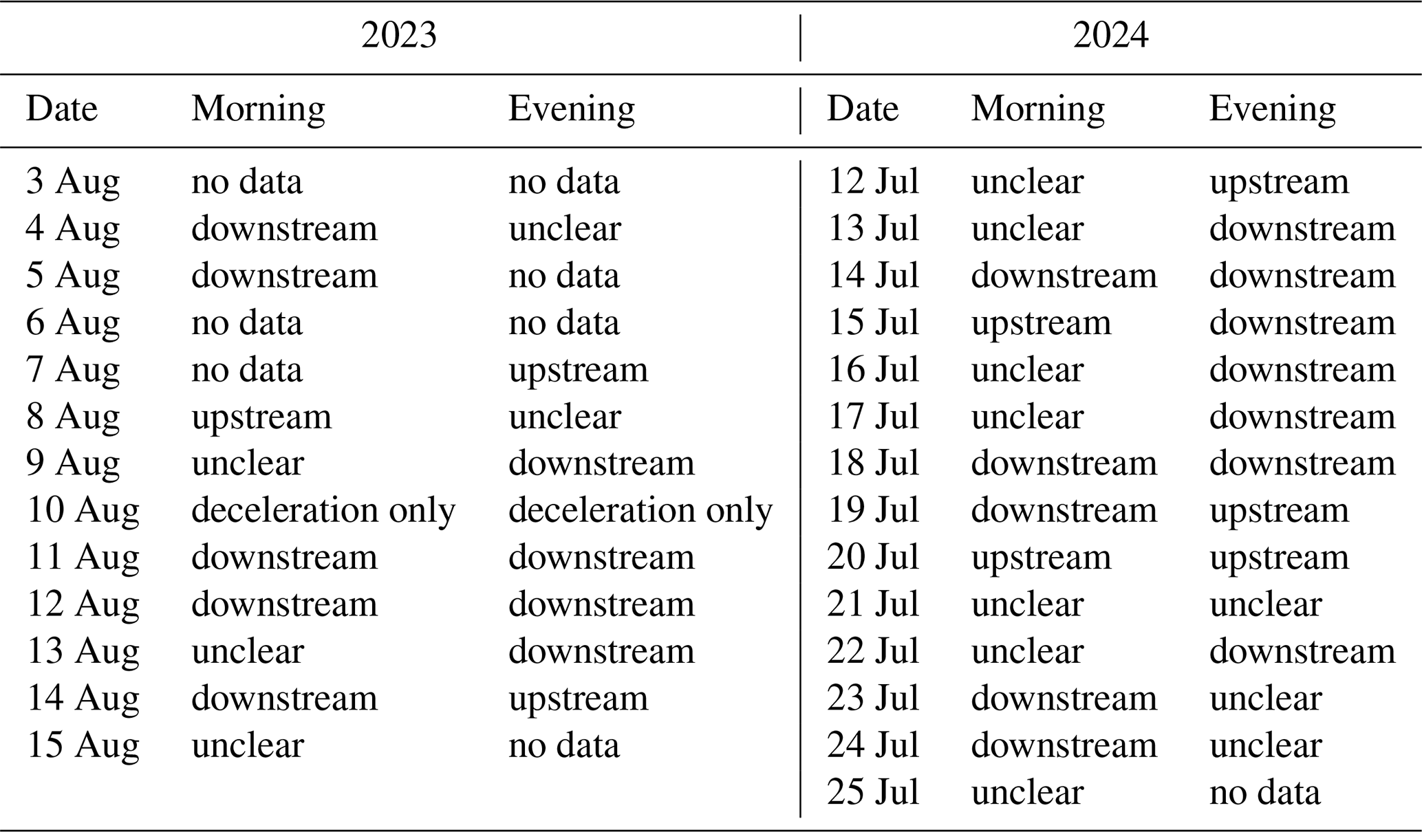 During high-velocity days, diurnal velocity changes initiate at the terminus and propagate upstream, whereas commonly diurnal accelerations start at locations further upstream and propagate downstream over time. The initiation of acceleration in the morning and deceleration in the evening generally occurs with a lag of about two hours between the terminus and the location 6 km upstream. This is visible in the inclined acceleration/deceleration signal with time on Fig. 4c and Fig. 5c. For better readability, a zoomed-in representation with supporting labels is provided in the Appendix (Fig. A8). In nearly half of the observed initiations, the velocity change starts earlier at the upper part, propagating downstream with time (manually detected and marked as orange boxes in Fig. 5c), whereas upstream propagations, when velocity changes are initiated at the front, only occur in 20 % of the cases (green boxes in same figure). The remaining 30 % labelled as “unclear” show either no clear propagation direction or a combination of an upstream and a downstream signal. Table B1 in the Appendix provides a complete overview of the acceleration transition types for both years.