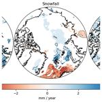 As linear trends can sometimes be misleading, Fig. 11 shows the difference in annual total precipitation, snowfall and liquid precipitation between the first (1979–1988) and last (2014–2023) decades of the study period. The overall conclusion is that the decadal differences largely follow changes shown in the trends. The larger amount of liquid precipitation over the north Atlantic sector is particularly striking. While the spatial pattern of trends in liquid precipitation (Fig. 10) is similar to the pattern of decadal differences shown in Fig. 11, the latter suggests more recent increases in liquid precipitation and decadal variability over land areas not captured in linear trends. Note in turn the large differences in snowfall over the Atlantic sector, locally 100 mm lower in the most recent decade, paired with more liquid precipitation.