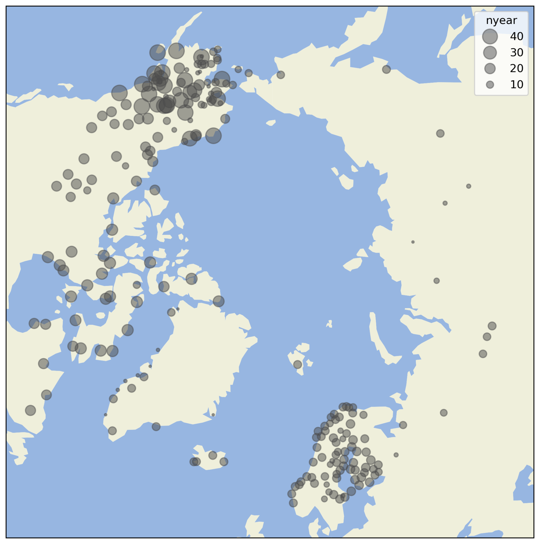 Figure 1Number of complete years with data shown as proportional circles for ASOS stations. A complete year is defined as having at least one precipitation event of any phase reported in all twelve months.