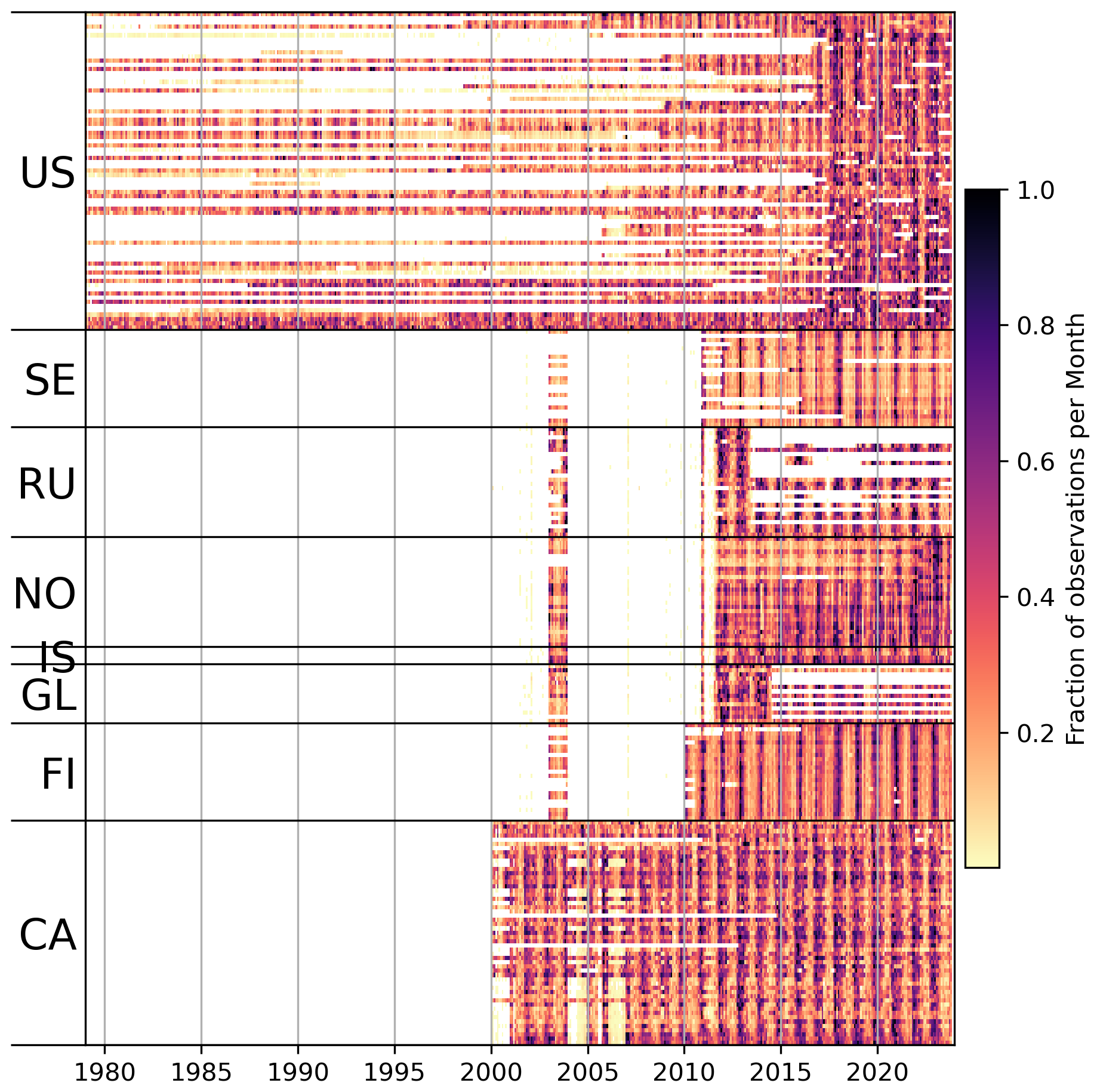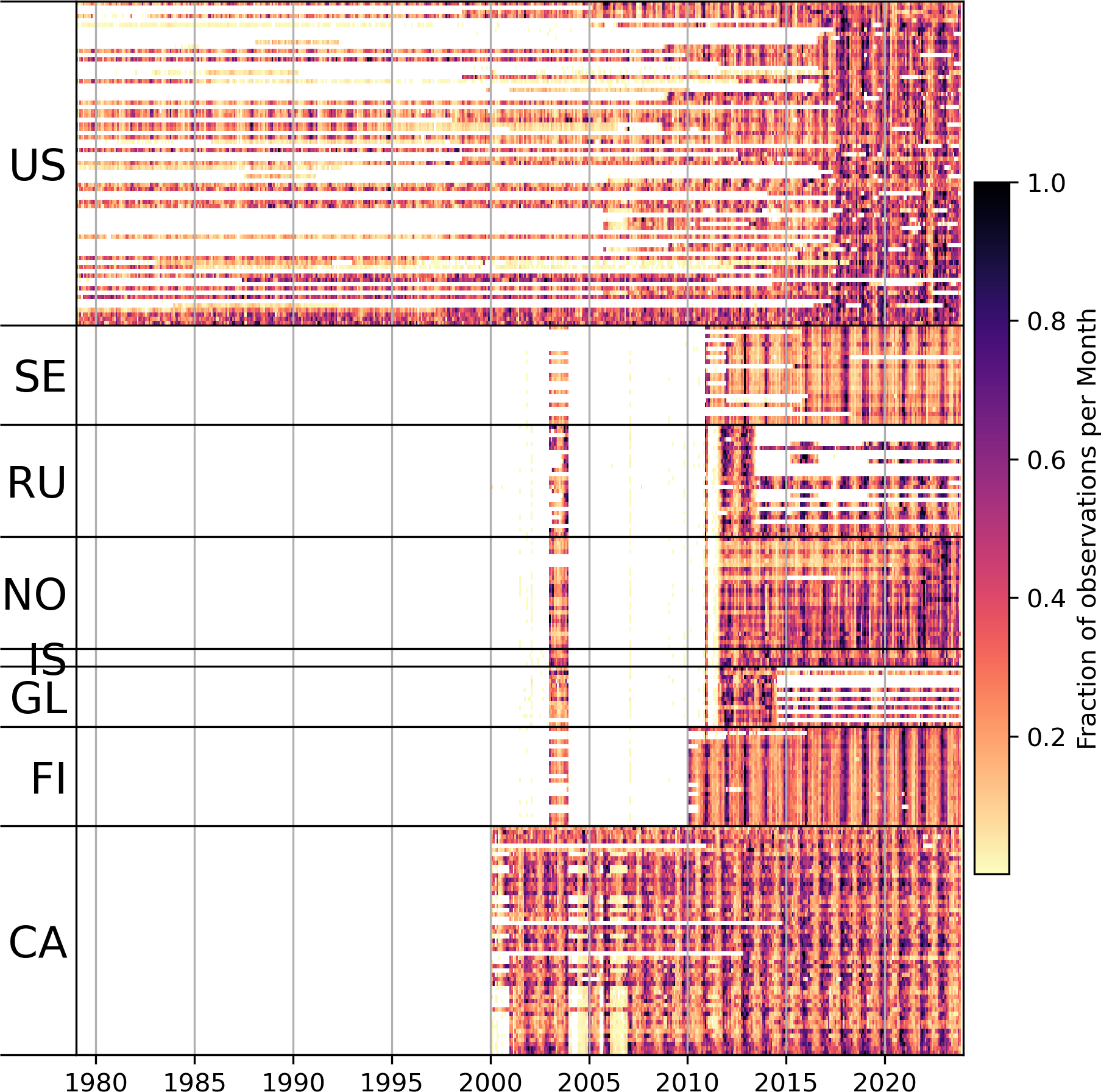 Figure 2Heatmap of liquid precipitation events by month for the 1979 to 2023 from the ASOS database. Colors represent the hours in each month in the 1979 to 2023 period that a station reported liquid precipitation. Reports are organized vertically by country and latitude. Country codes are US United States, SE Sweden, RU Russia, NO Norway, IS Iceland, GL Greenland, FI Finland, CA Canada. Latitude is in ascending order for each country grouping.