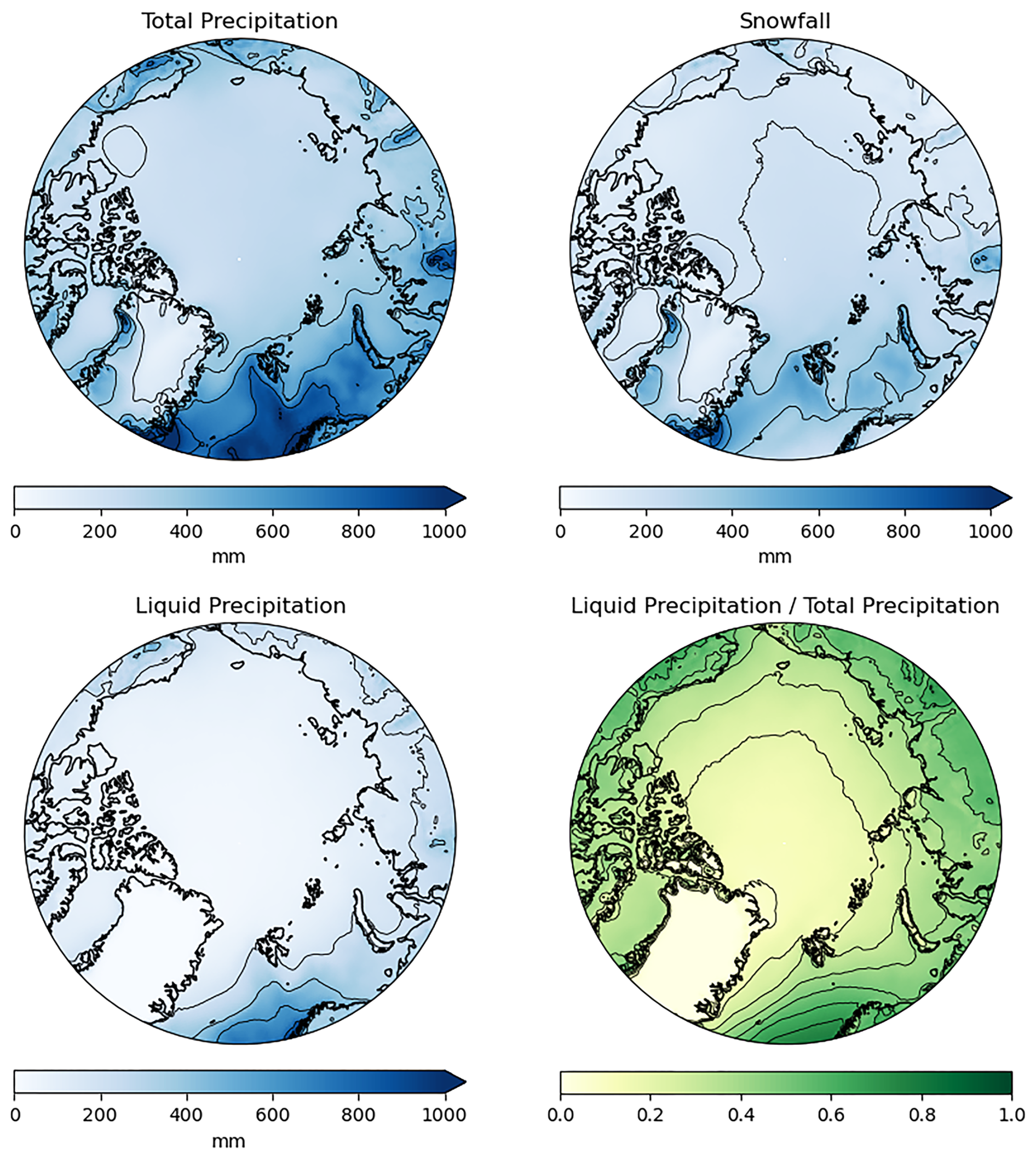 Figure 3Spatial distribution of average annual totals (1973–2023) of total precipitation, snowfall, liquid precipitation and the liquid/total precipitation ratio from ERA5. Black contours are drawn on the figures for ease of viewing and occur every 200 mm for the total precipitation, snowfall, and liquid precipitation and every 0.1 for the liquid/total precipitation plot in the lower right panel.
