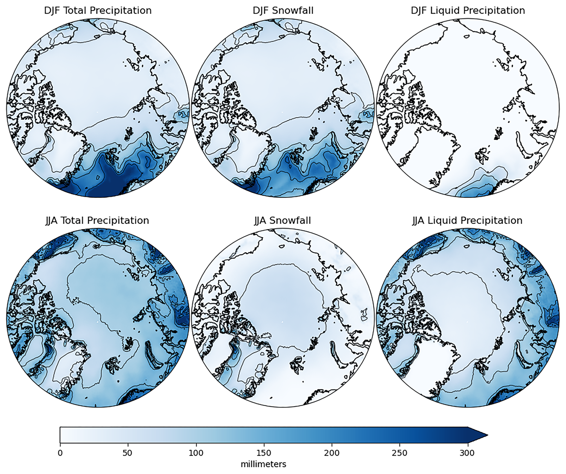 As is clear from Fig. 4, there are prominent contrasts between winter and summer in snowfall and liquid precipitation. The amount of snowfall is a function of both precipitation amount and temperature, which bears on whether precipitation is in liquid or solid form. For example, over the central Arctic Ocean, the low winter snowfall is primarily a function of low precipitation, while over the land areas in summer, the low snowfall (close to zero in some areas) is due to temperature. Over much of the North Atlantic sector, high winter precipitation leads to ample snowfall.