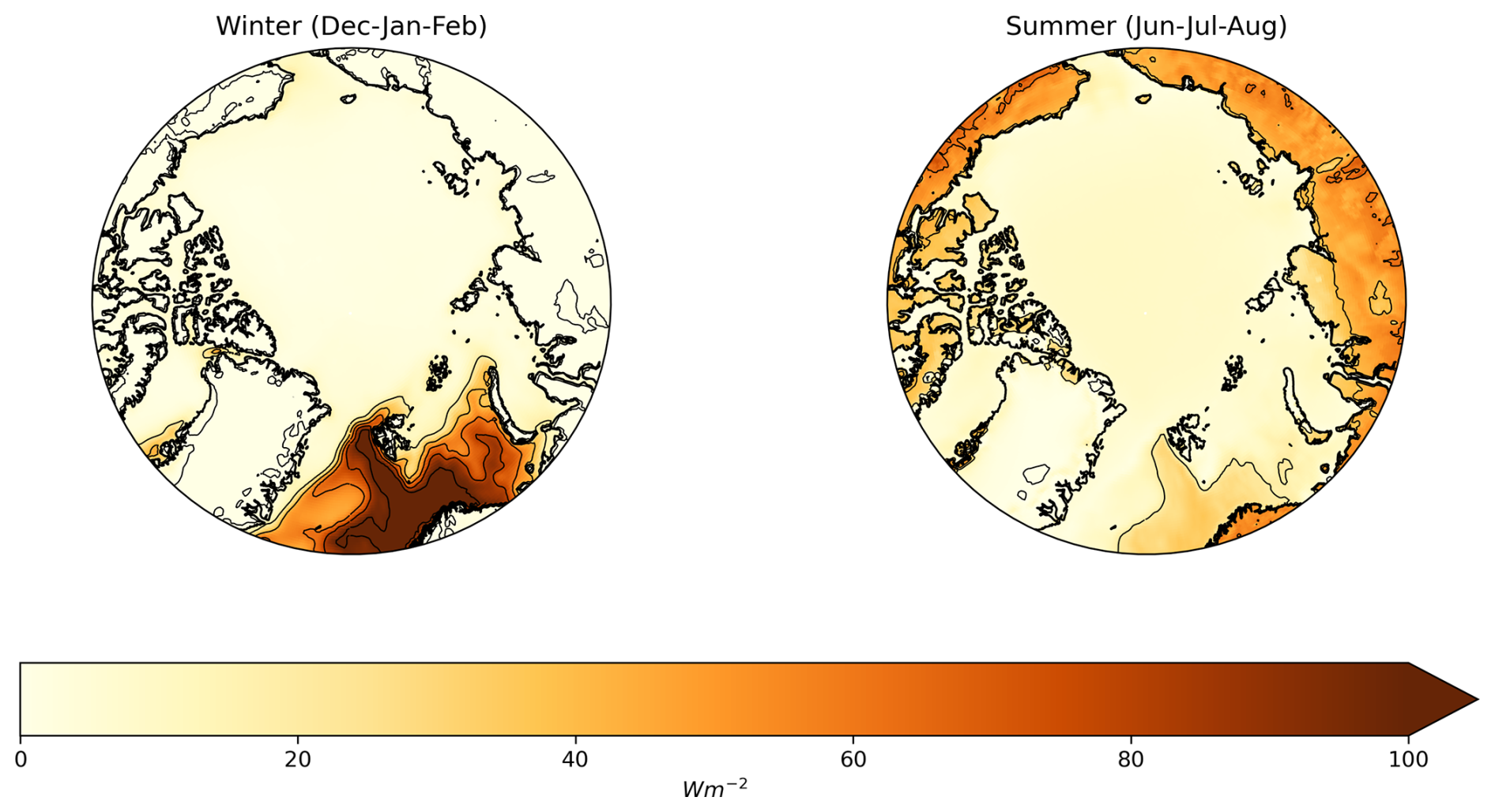 Attention now turns to seasonality, looking first at contrasts between winter (December, January, February (DJF)) and summer (June, July, and August (JJA)) of precipitation, snowfall and liquid precipitation (Fig. 4). Winter precipitation is particularly low over the central Arctic Ocean and most land areas, reflecting low temperatures (hence little atmospheric moisture) and distance from Atlantic moisture sources. The much higher winter precipitation over the North Atlantic sector clearly stands out. The North Atlantic cyclone track is most active at this time of year. Cyclones are passing over open ocean and can pick up ample moisture. Average winter latent heat fluxes over the ice-free Atlantic sector as depicted in ERA5 are on the order of 80 W m−2 or even higher, compared to much lower values over the ice-covered central Arctic Ocean and land areas (Fig. 5). Ólafsson and Økland (1994) describe how Arctic air masses moving over these warm Atlantic sector waters develop convective boundary layers that enhance precipitation.