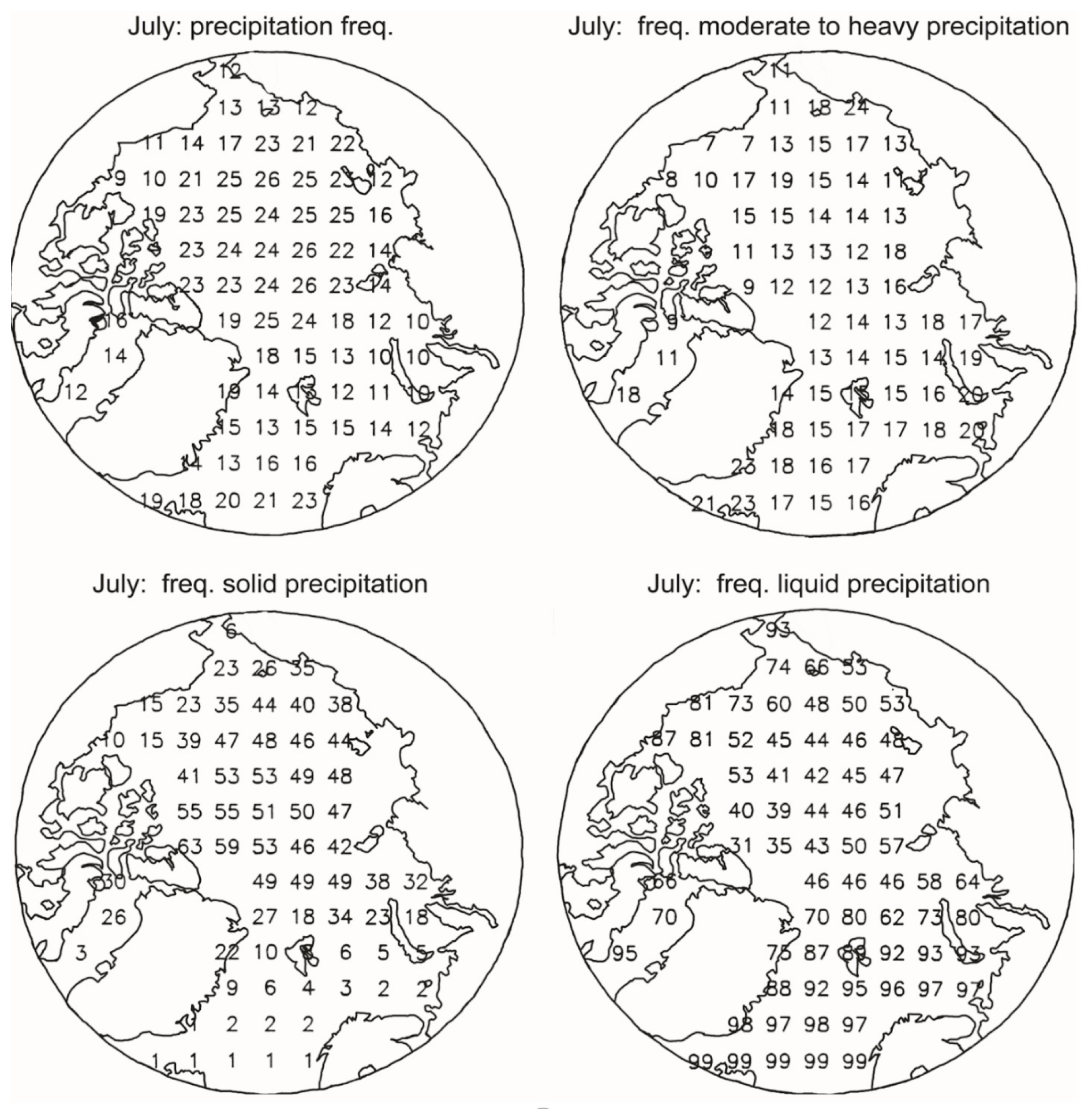 Figure 8Precipitation frequency (top left panel), the frequency of moderate to heavy precipitation (top right panel), and the frequency of precipitation phase – solid (lower left panel) and liquid (lower right panel) over the Arctic Ocean for July, based on ICOADS data, reproduced from Serreze et al. (1996) (units %).