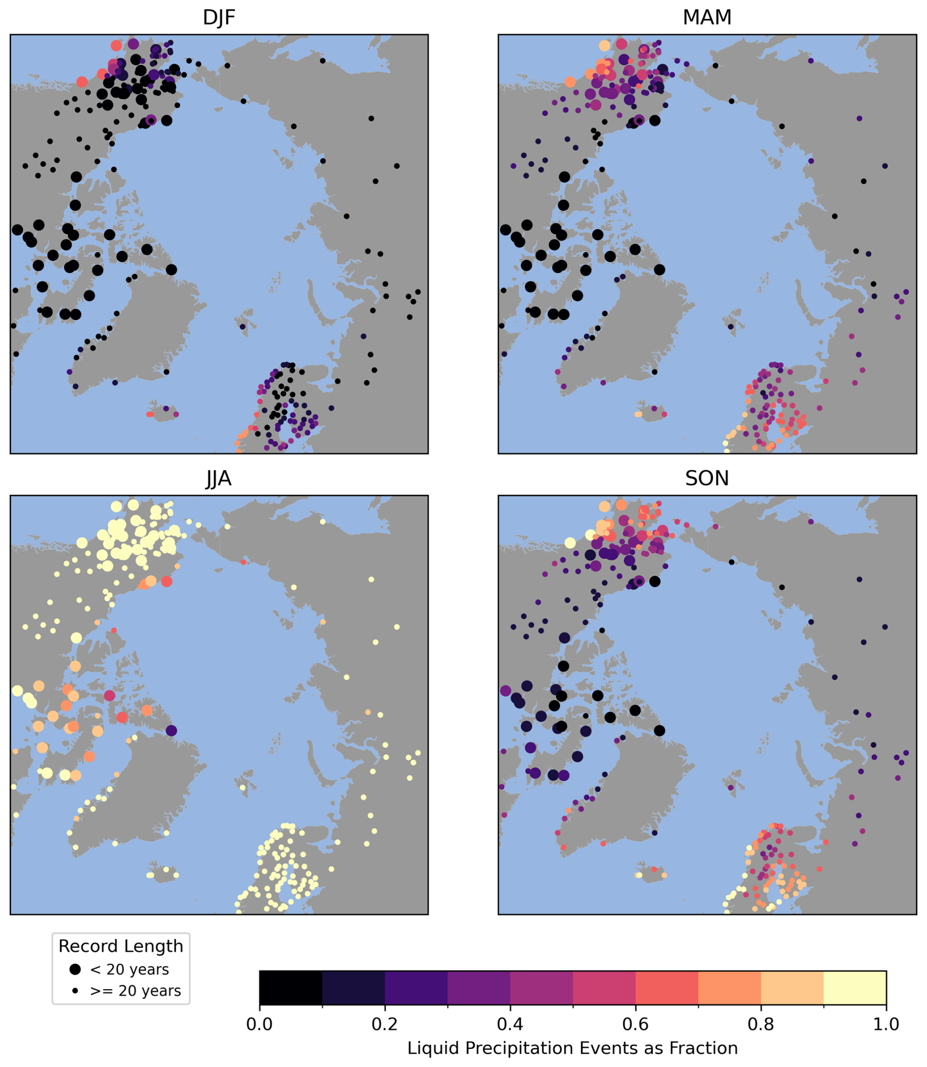 Figure 9Number of hours with liquid precipitation expressed as a fraction of the total number of hours with any type of precipitation for the climatological seasons from the ASOS database. Large symbols represent stations with more than 20 years of data for the 1979 to 2023 period. Small symbols are for stations with shorter records.