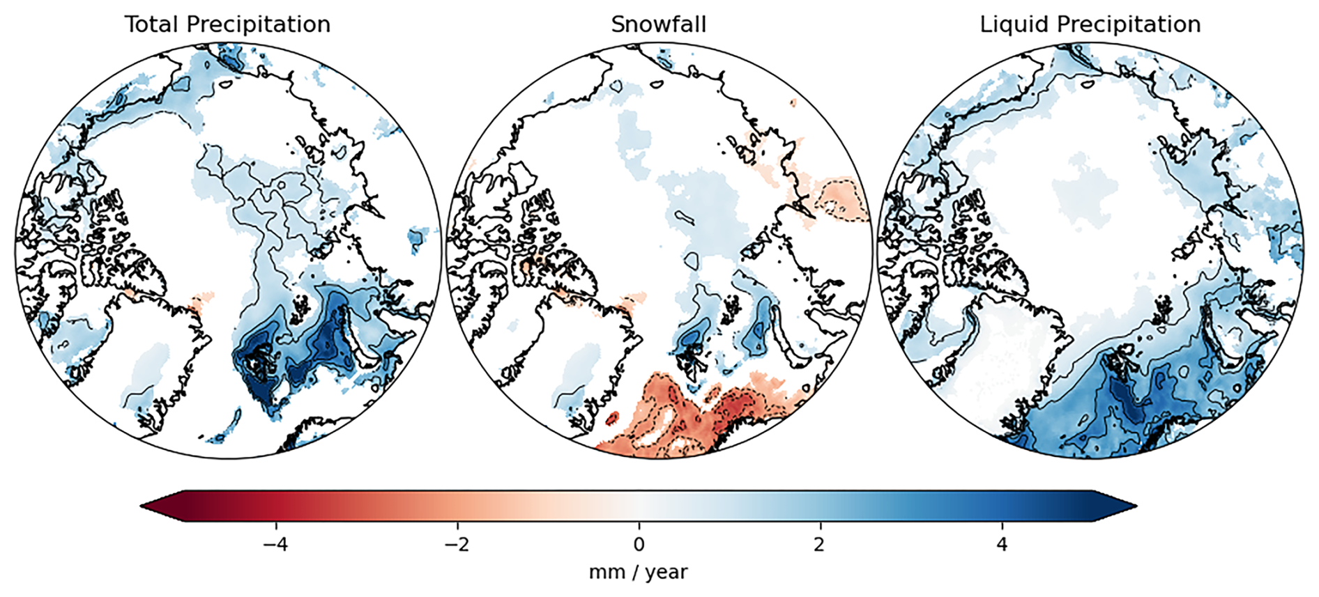 Annual snowfall has fairly pronounced downward trends only over the warm Atlantic side of the Arctic, but largely south of the area with the largest precipitation trends. Liquid precipitation by contrast has widespread positive annual trends over most of the North Atlantic sector pointing to the warming conditions.