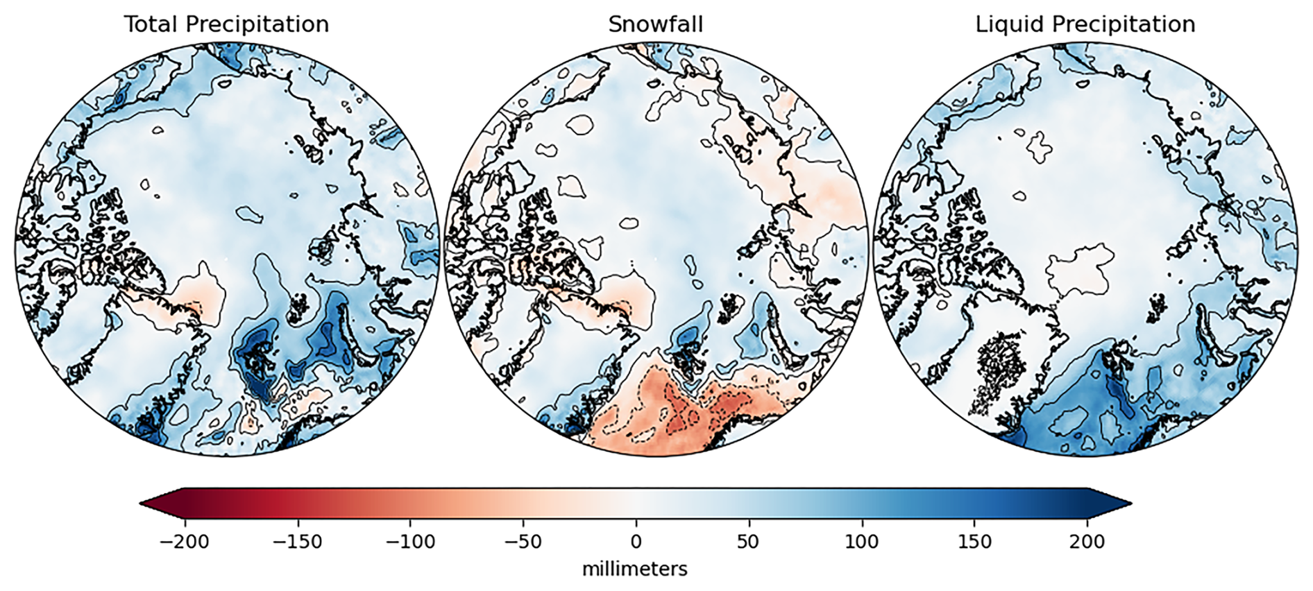 Arctic surface air temperatures are increasing more rapidly than for the globe as a whole (Rantanen et al., 2022). This Arctic Amplification of warming is associated with changing precipitation patterns. Historically, most of the annual precipitation in the Arctic (apart from the warm Atlantic sector) has fallen as snow. However, as the Arctic warms, one expects both an increase in total precipitation (due to more atmospheric water vapor and a stronger poleward moisture flux convergence), a shift towards more rainfall, and larger precipitation events (e.g., Dou et al., 2022; McCrystall et al., 2021). Indeed, annual precipitation for the Arctic viewed as a whole now appears to have a detectable upward trend (Moon et al., 2024).