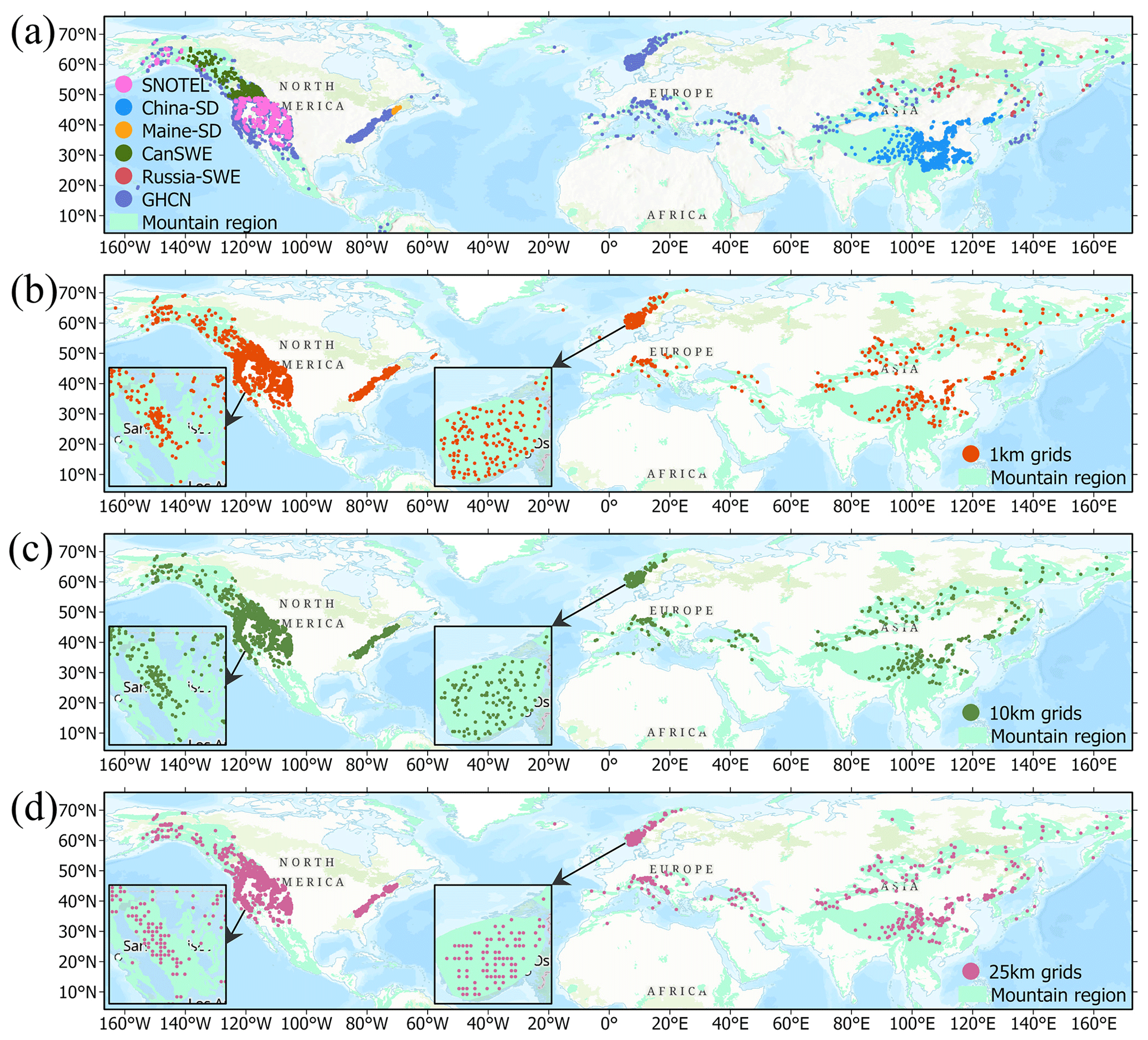 Figure 1Spatial distribution of (a) stations in various SD datasets and of the matched grids at the (b) 1 km, (c) 10 km, and (d) 25 km scales. Zoomed-in views show the detailed distributions of grid locations in the Sierra Nevada range over the US and the Jotunheimen mountain range in Norway and Sweden. Base map sources: Esri, TomTom, Garmin, FAO, NOAA, USGS, EPA, USFWS.