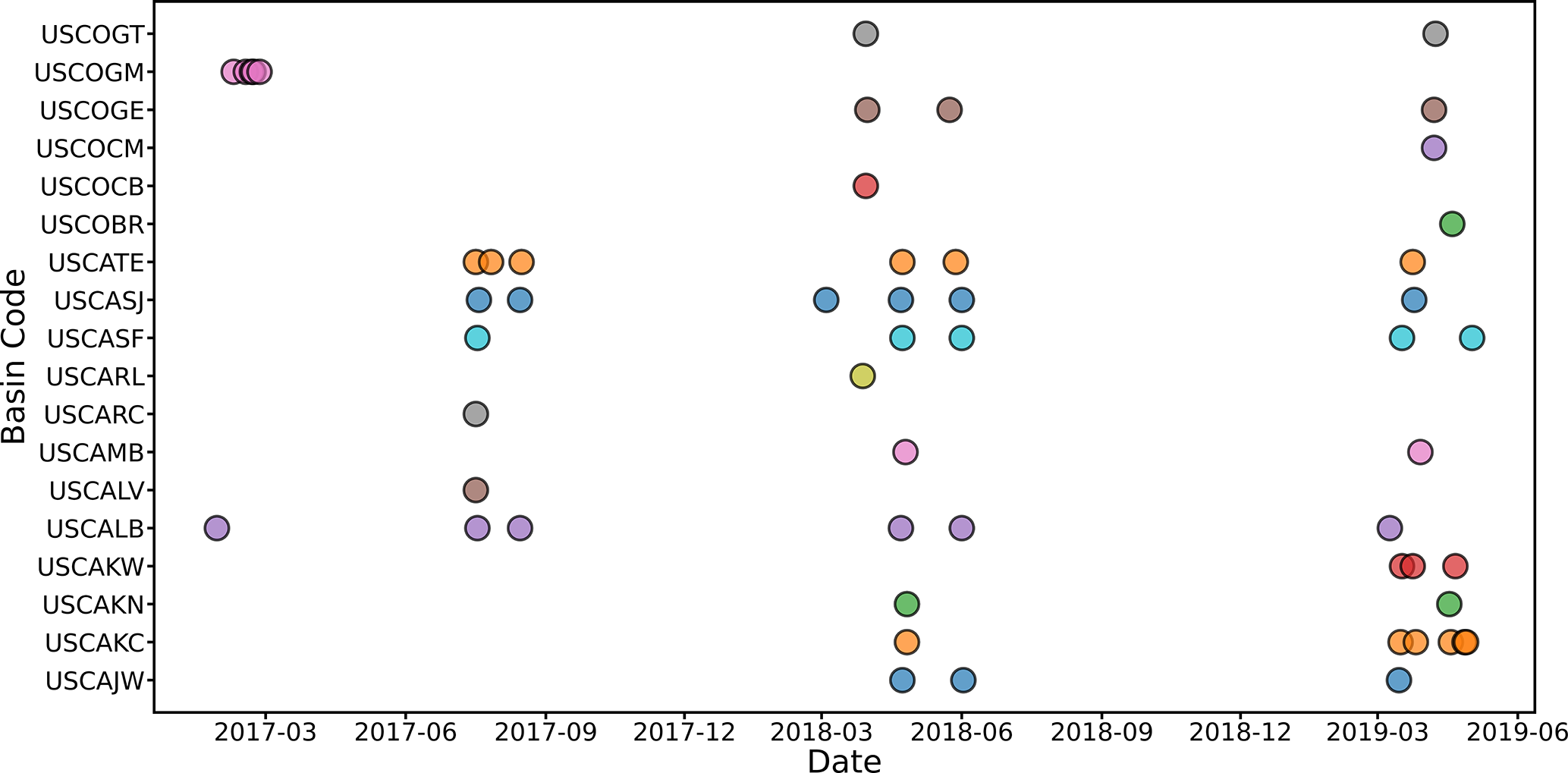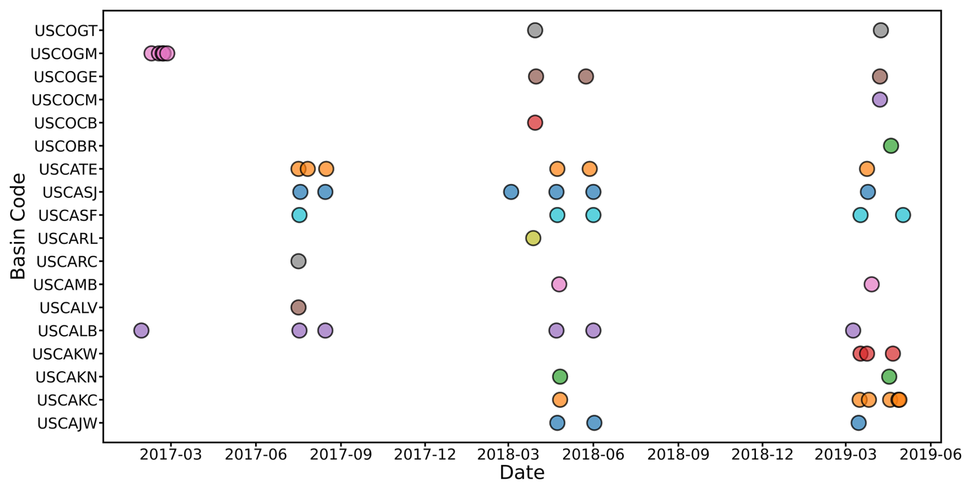 The ASO data provide high-resolution, spatially comprehensive measurements of SD, SWE, and snow albedo in mountain basins by combining airborne lidar, imaging spectrometry, and physically-based snow modeling (Painter et al., 2016). Airborne remote sensing campaigns over the western US were conducted from 2013 to the present, and hyperspectral reflectance and LiDAR SD data were collected in Colorado, California, Oregon, and Washington. These data are used to develop standard basin-scale instantaneous SD maps, with a resolution of 3 m and an evaluated accuracy of 0.08 m (Painter et al., 2016). The ASO SD is calculated using scanning LiDAR measurements, a straightforward and robust approach involving the subtraction of snow-free surface elevation data from snowpack surface elevation data. To assess and compare the accuracy of the C-snow product at different scales, we obtained 59 ASO maps (within California and Colorado) at a 3 m resolution from September 2016 to May 2019. Figure 2 provides the statistics of the available measurements by basin and date.