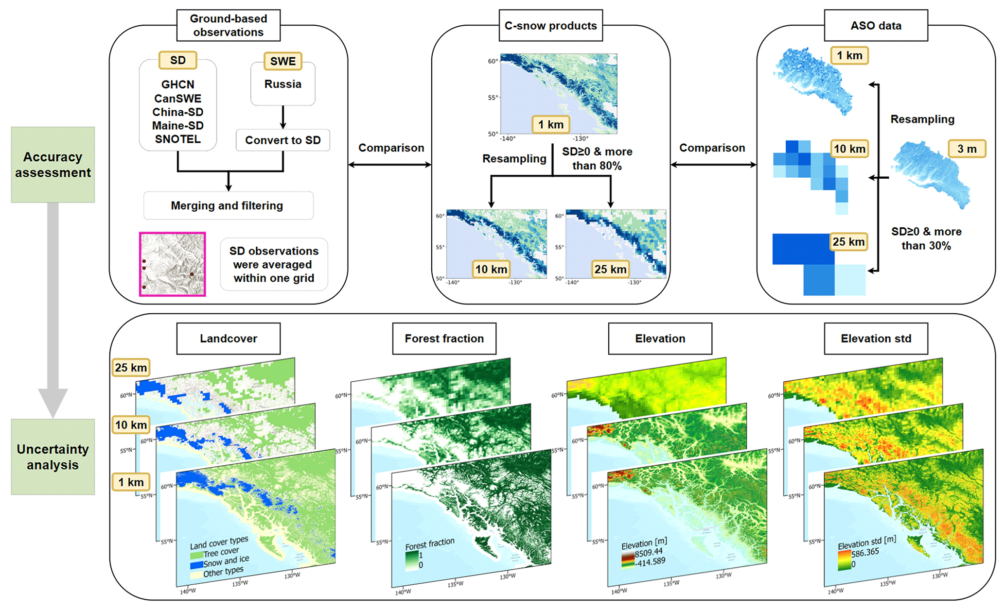 Figure 3 shows the workflow of this study. To assess the accuracy of C-snow retrieval at different scales, the 1 km C-snow product was resampled to 10 and 25 km. Here, we directly used the mean resampling method according to previous studies (Broxton et al., 2024; Herbert et al., 2024). Moreover, we tested and compared the mean and median sampling methods and obtained similar validation results. To control equality and the representativeness of coarse-resolution pixels, we selected only the 10 and 25 km grids in which the percentage of the snow-covered area was at least 80 %. The average 1 km SD values within the coarse-resolution pixels were then used as the 10 or 25 km-scale products (Fig. 3). To compare C-snow with station-based data and ASO observations at different scales, we also resampled the 3 m-resolution ASO data to 1, 10, and 25 km. When the ASO data were resampled, we calculated only the average for grids for which the number of 3 m ASO observations at larger scales (1, 10, and 25 km) was not less than 30 %. Here, we selected 30 % to ensure a sufficient quantity and representativeness of the validation samples.