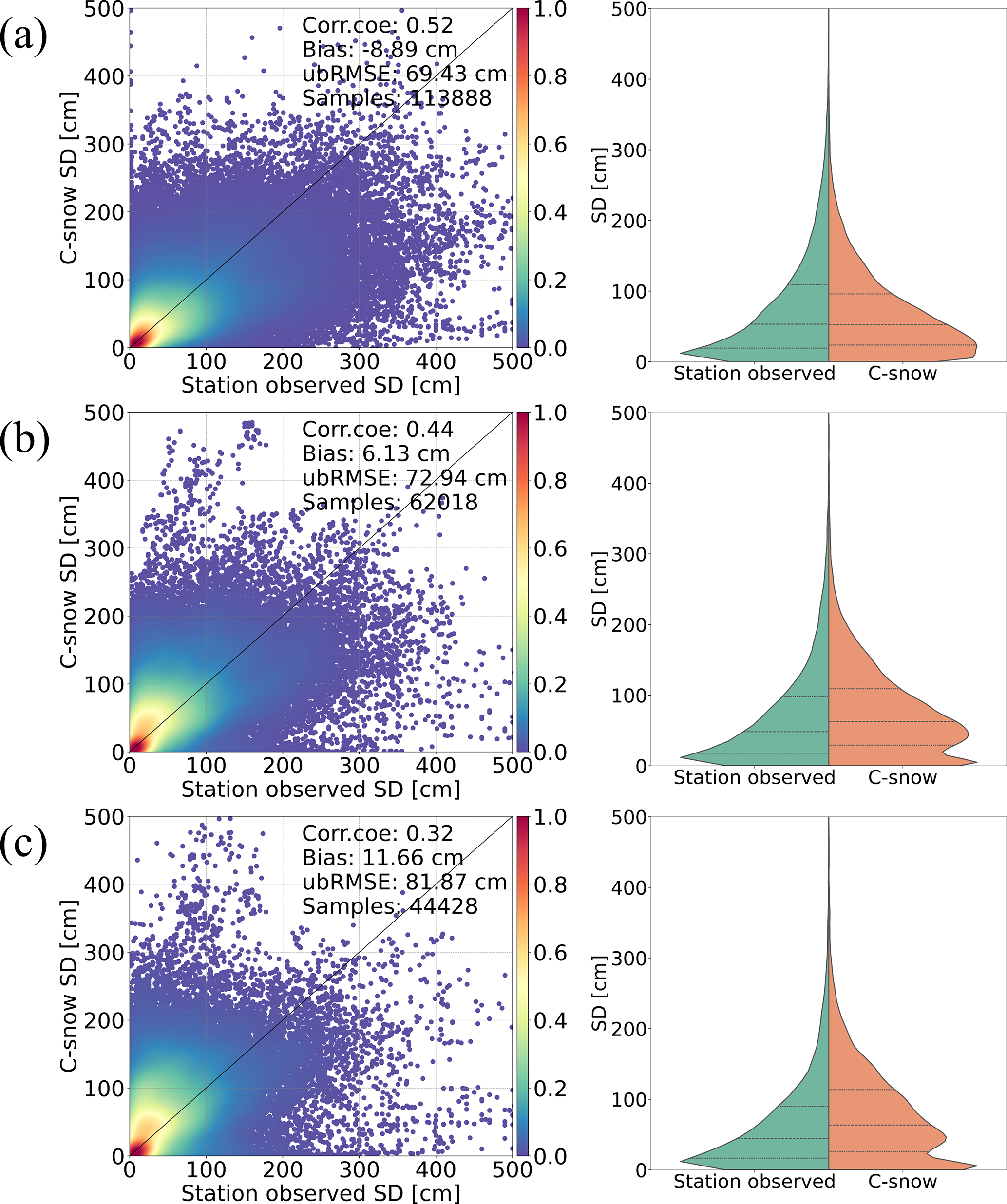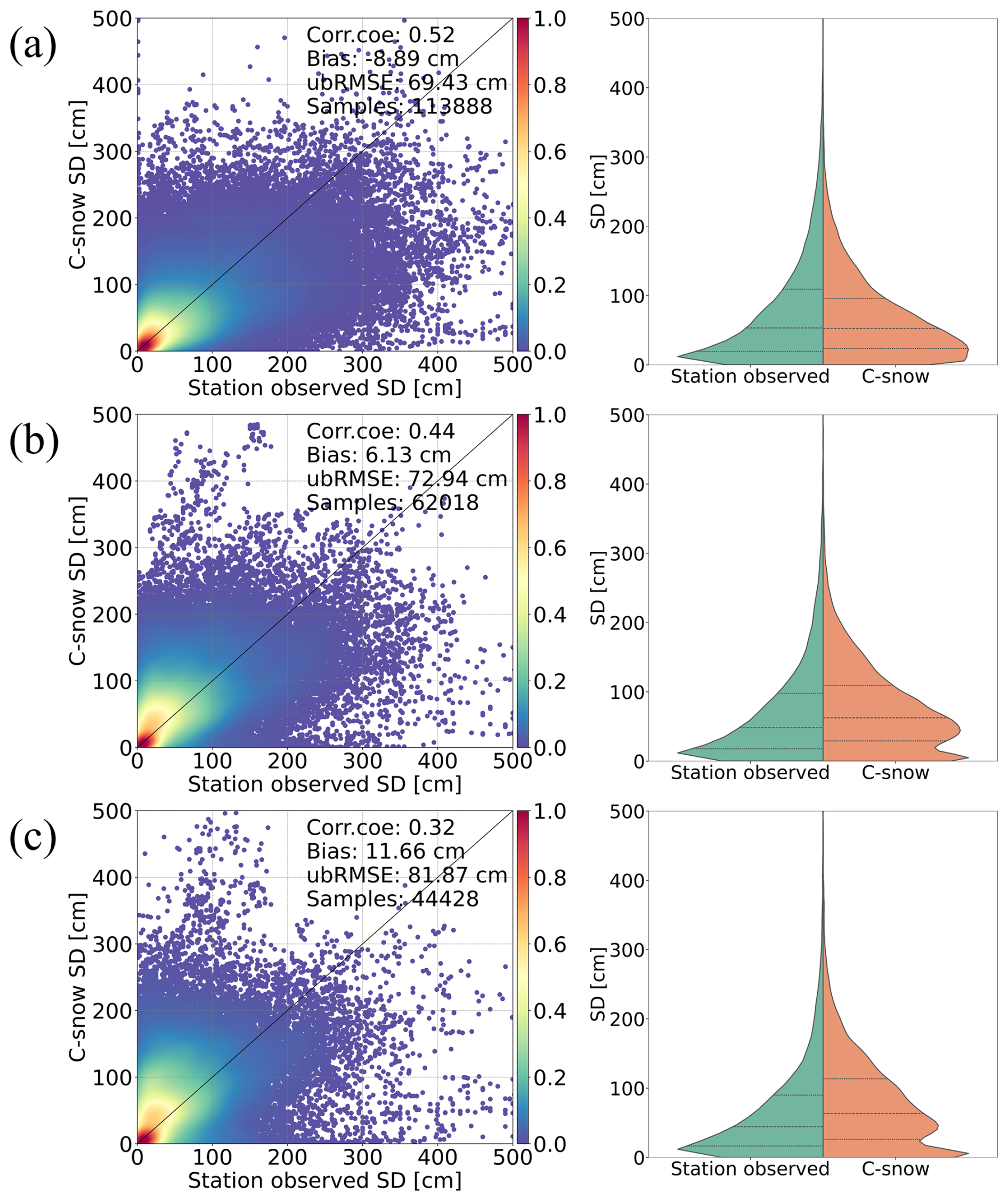 Figure 4Comparisons (left column) and distributions (right column) between the C-snow SD and the station-observed SD at (a) 1 km, (b) 10 km, and (c) 25 km scales. The dashed lines in the right column indicate the 25th, 50th and 75th percentiles.