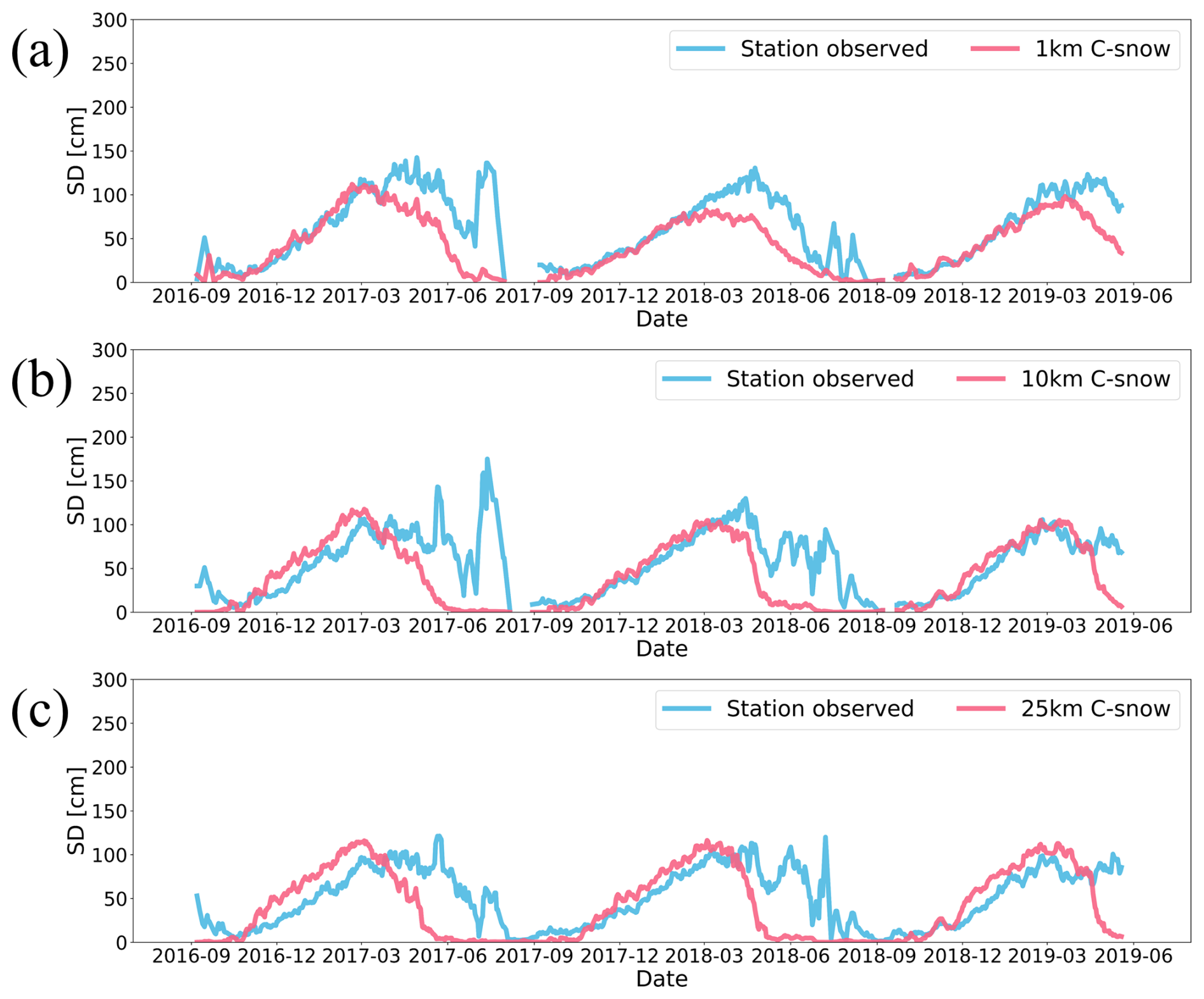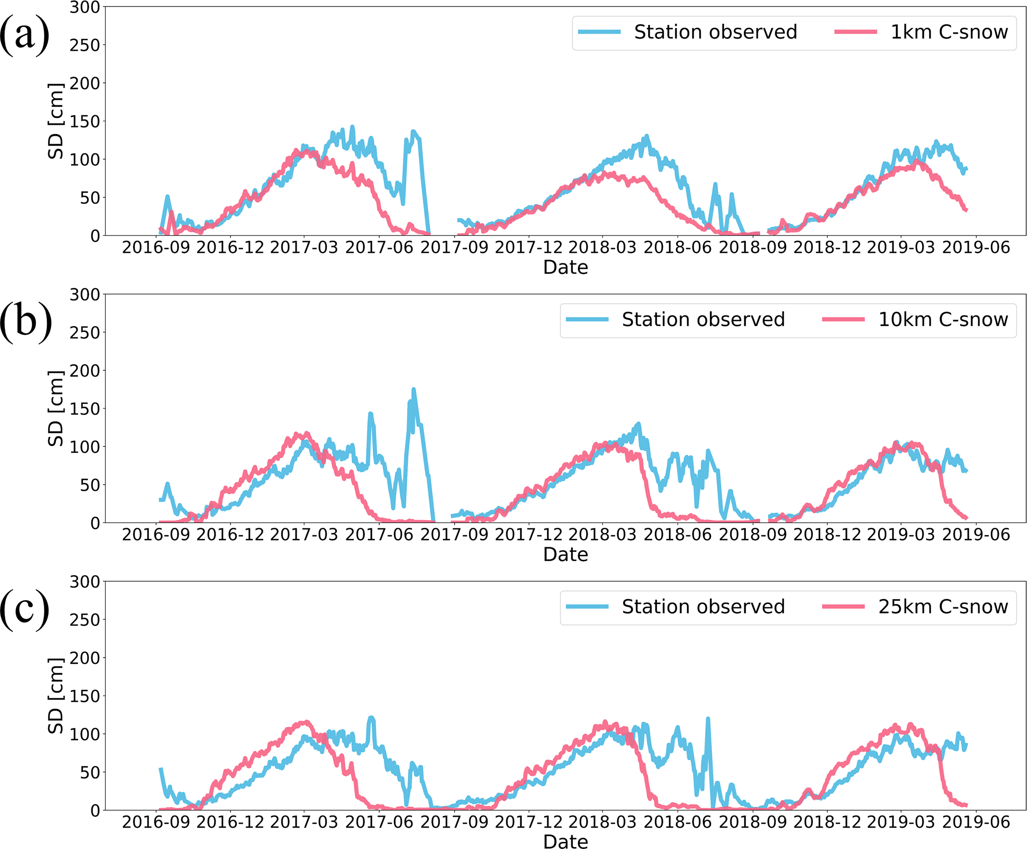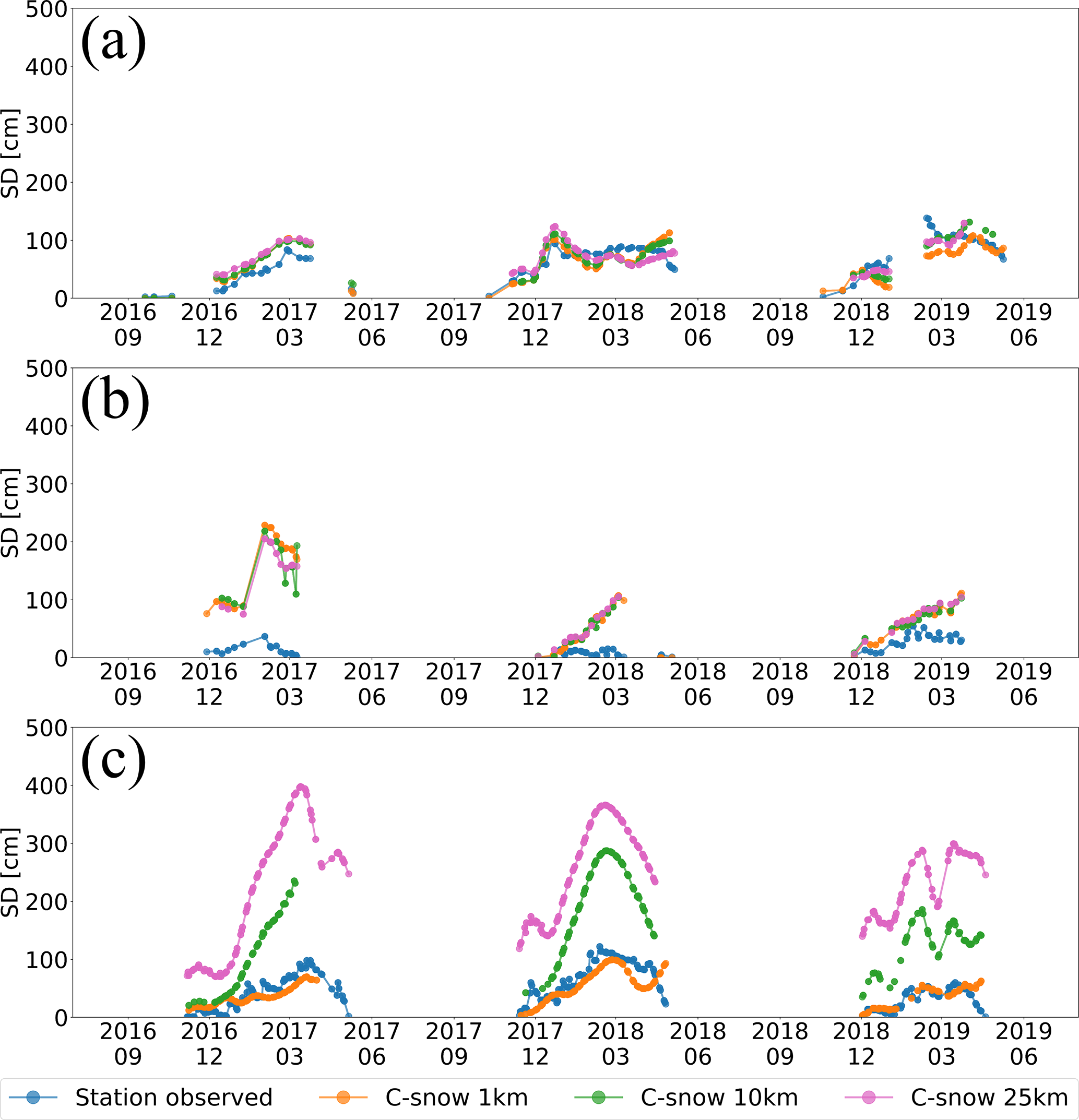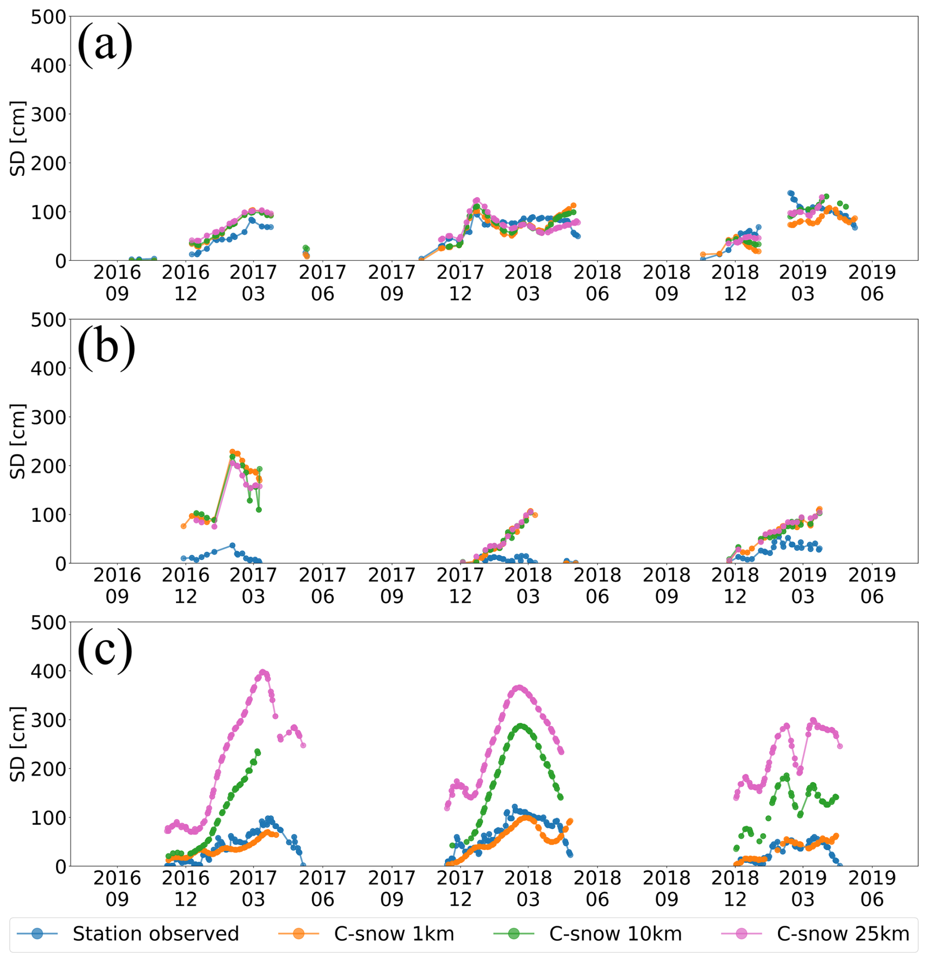 Figure 5Average weekly SD time series of stations and corresponding C-snow grids at (a) 1 km, (b) 10 km, and (c) 25 km resolution across the mountainous regions of the Northern Hemisphere.