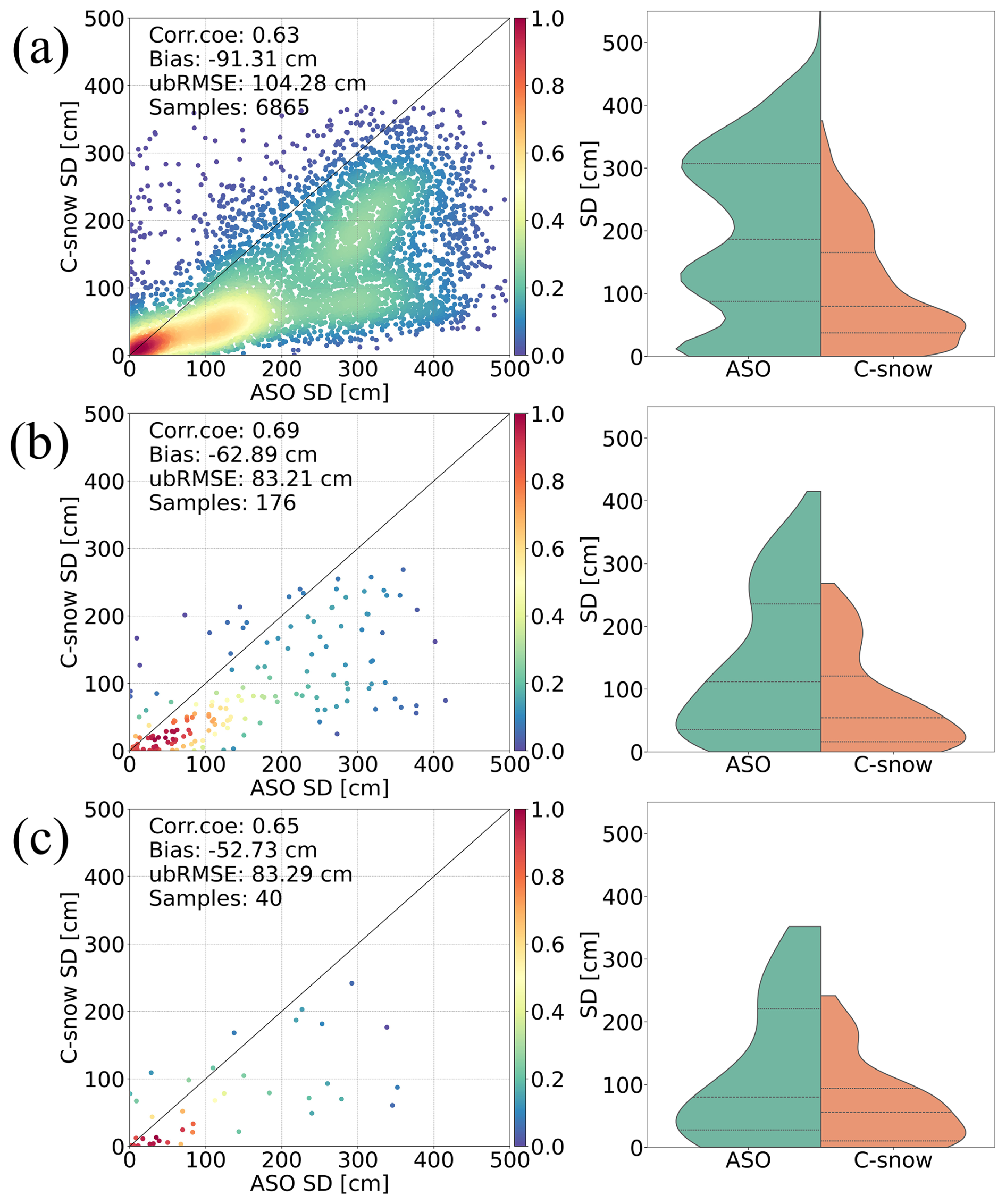 Figure 6Comparisons (left column) and distributions (right column) between C-snow SD products and ASO SD at different scales, where panels (a), (b), and (c) represent scales of 1, 10, and 25 km, respectively. The dashed lines in the right column indicate the 25th, 50th, and 75th percentiles.
