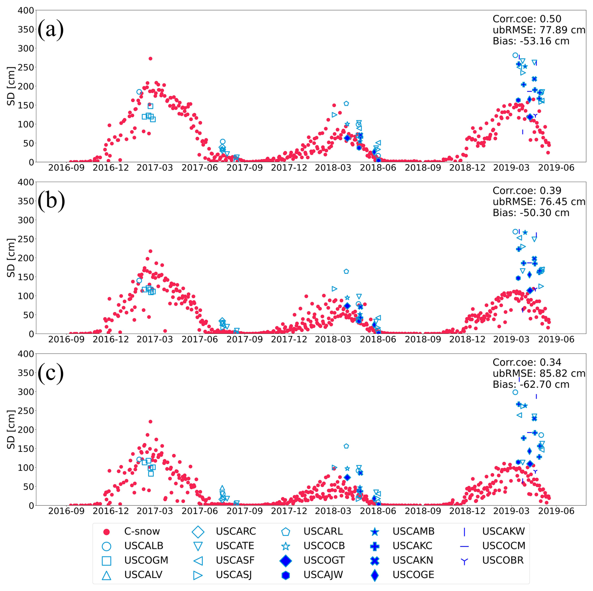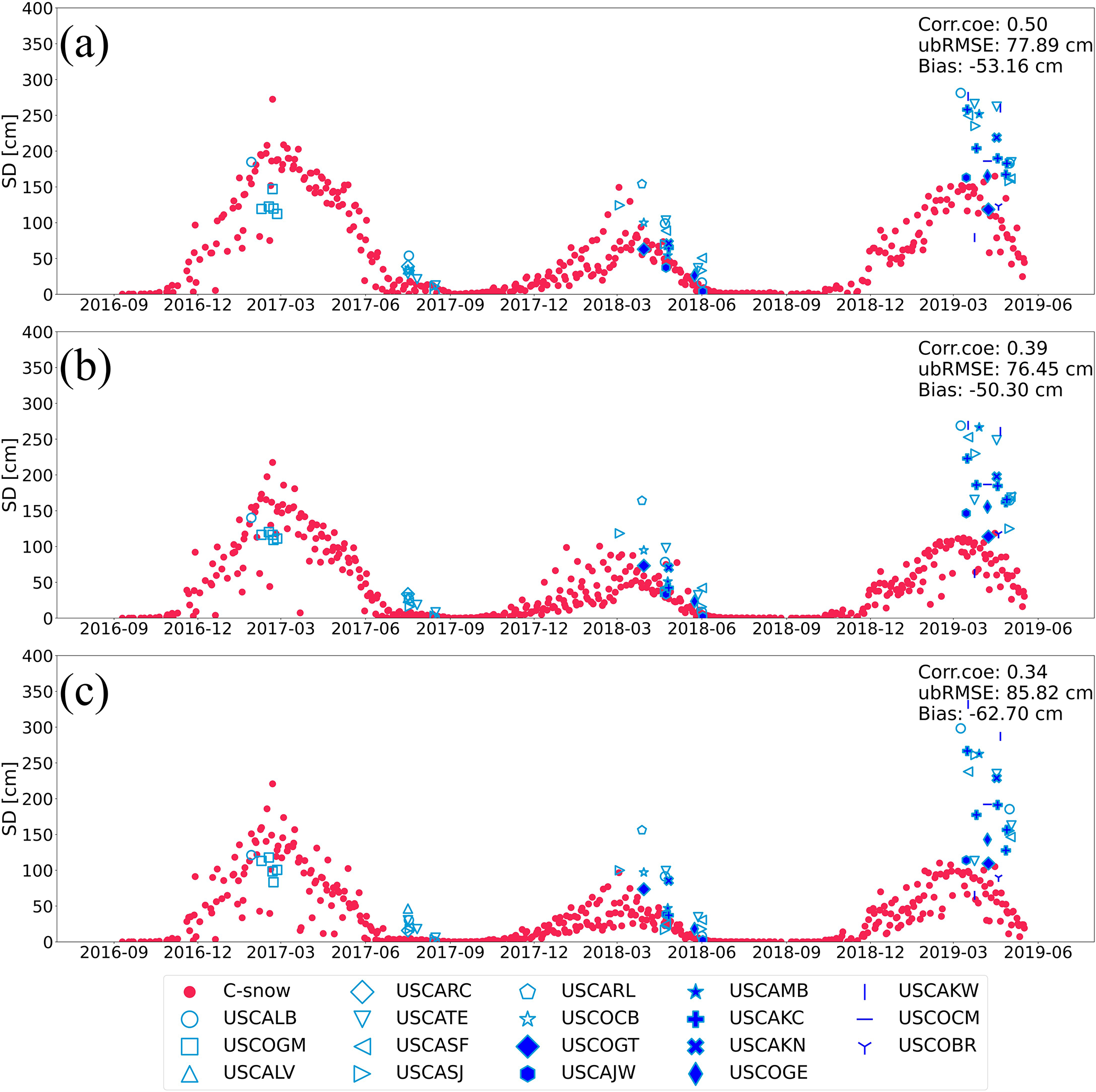 Figure 7Time series comparison of C-snow products with ASO observations averaged across multiple basins in California and Colorado at (a) 1 km, (b) 10 km, and (c) 25 km scales. The red points represent the average daily C-snow SD in all the selected basins, and the different blue symbols indicate the daily average ASO data in various basins.