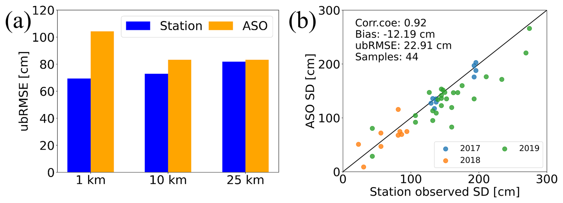 Figure 8(a) Accuracy performance of the C-snow product at different scales when station observations and ASO SD data are used as reference data and (b) a comparison of station data and ASO observations (3 m ASO data are used to match the station data).