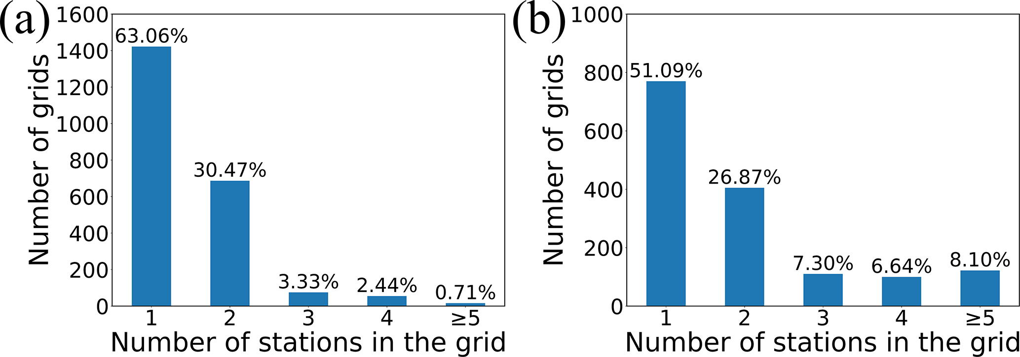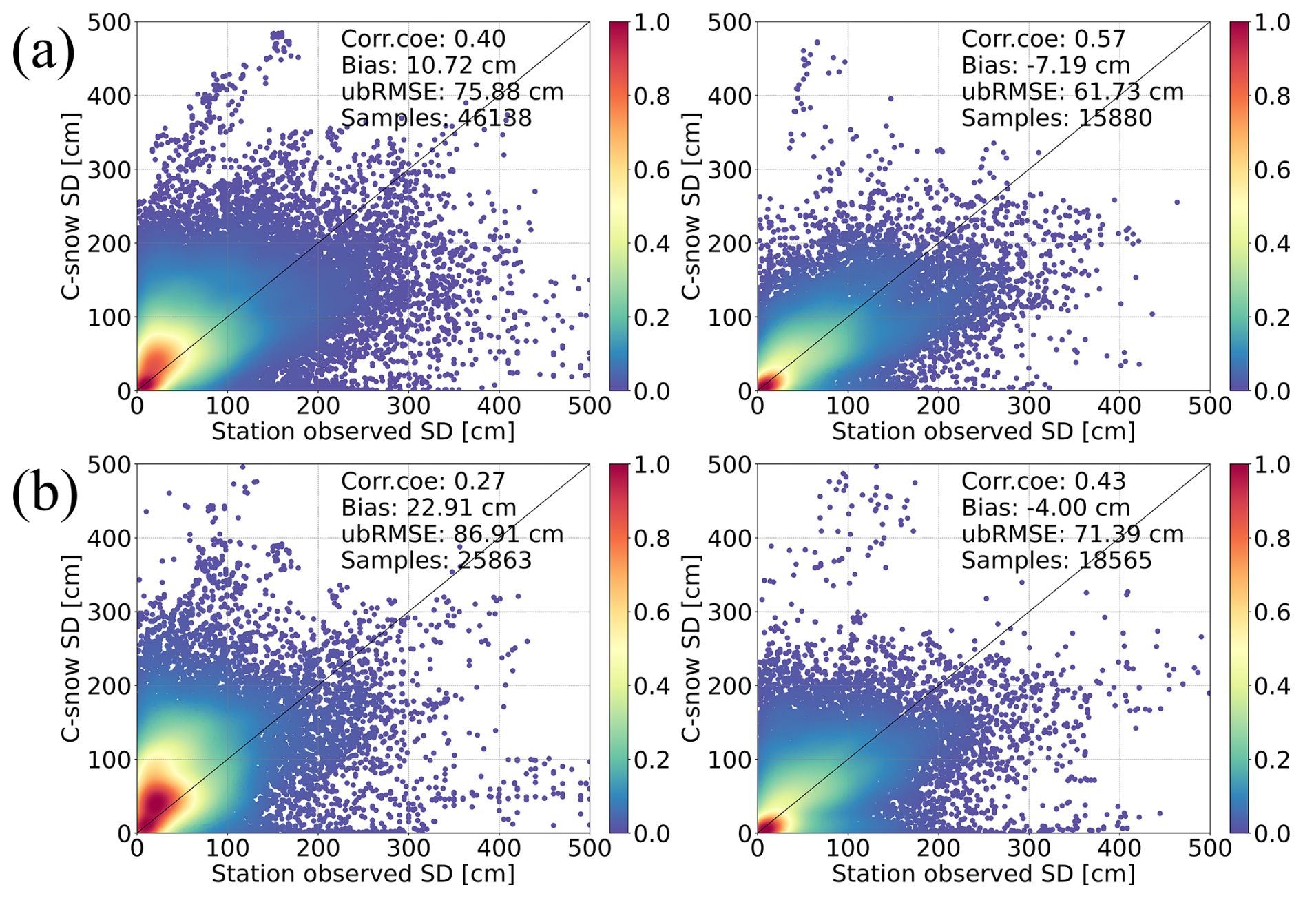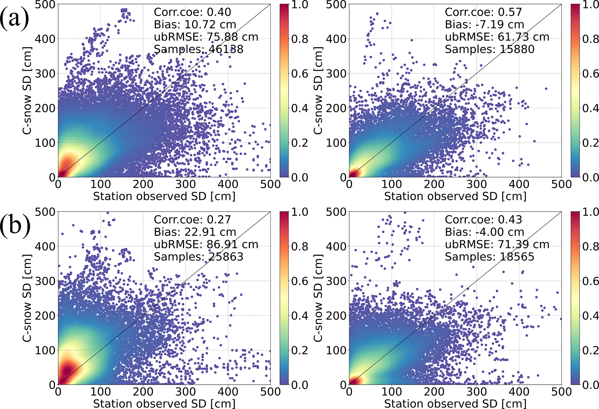 Figure 9Impact of the number of stations within grids at the (a) 10 km and (b) 25 km scales on the accuracy of the C-snow product. The left column presents the C-snow evaluation result when there is only one station within the grid, and the right column presents the evaluation result when there is more than one station within the grid.