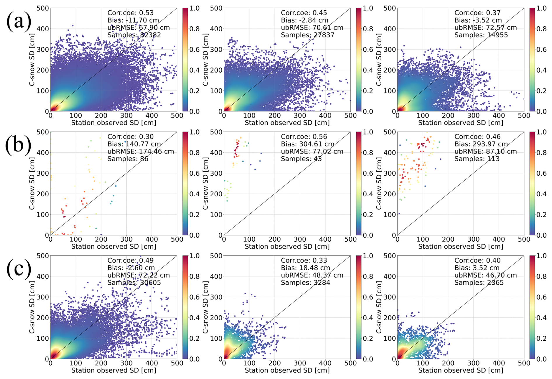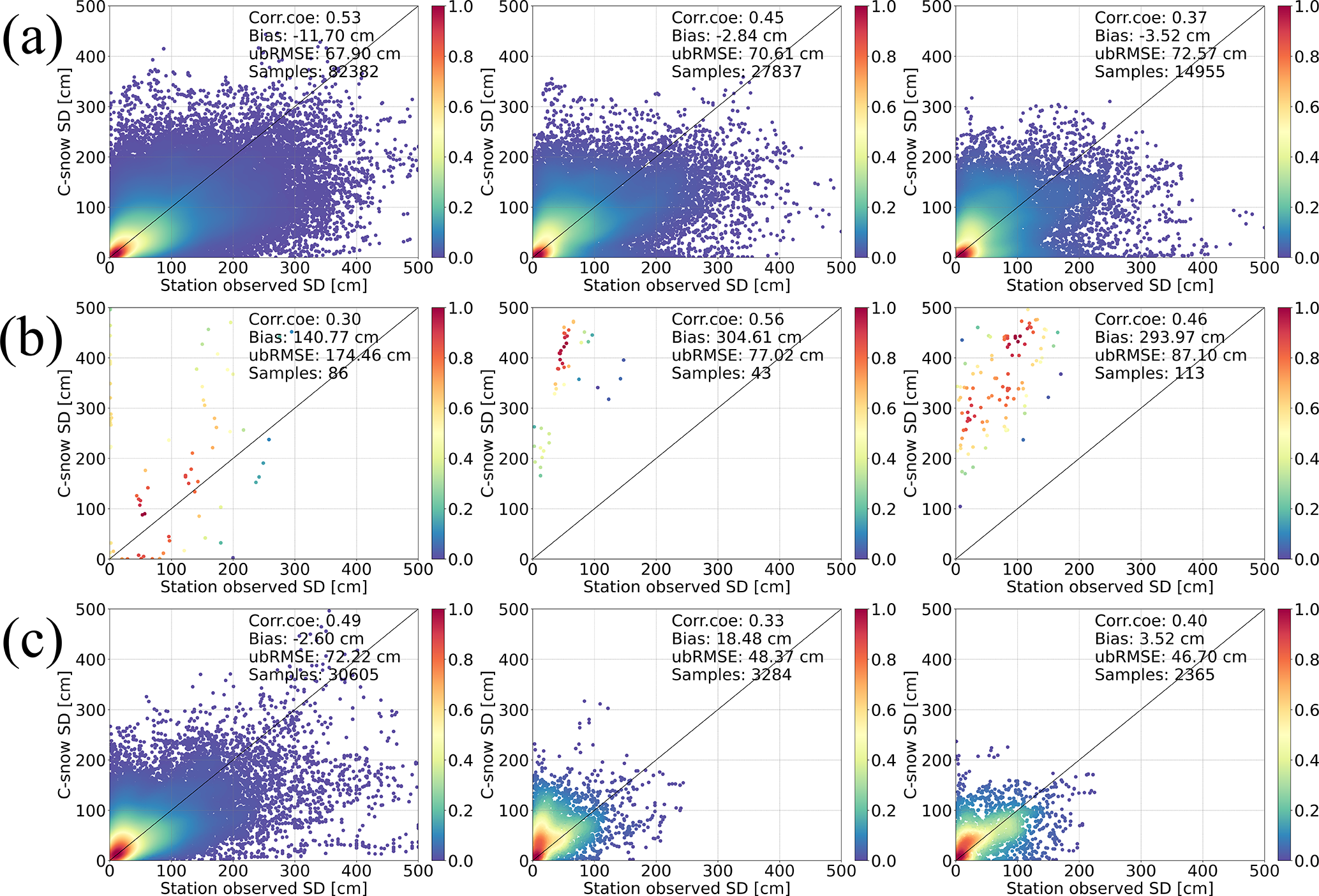 We evaluated the C-snow SD retrievals through comparisons with station-based measurements across different spatial scales. Figure 4 displays a comparison of the station measurements and the C-snow products at different scales. As the scale increases, corr.coe decreases from 0.52 to 0.32. Additionally, ubRMSE increases from 69.43 to 81.87 cm, reflecting increased uncertainty. Moreover, as the scale increases, the mean bias shifts from a slight underestimation of −8.89 cm to a slight overestimation of 11.66 cm. The decreased correlation is reasonable because the station observations are point-scale measurements. Even for pixels with multiple stations, it is difficult to obtain a continuously distributed SD map using a limited number of samples.