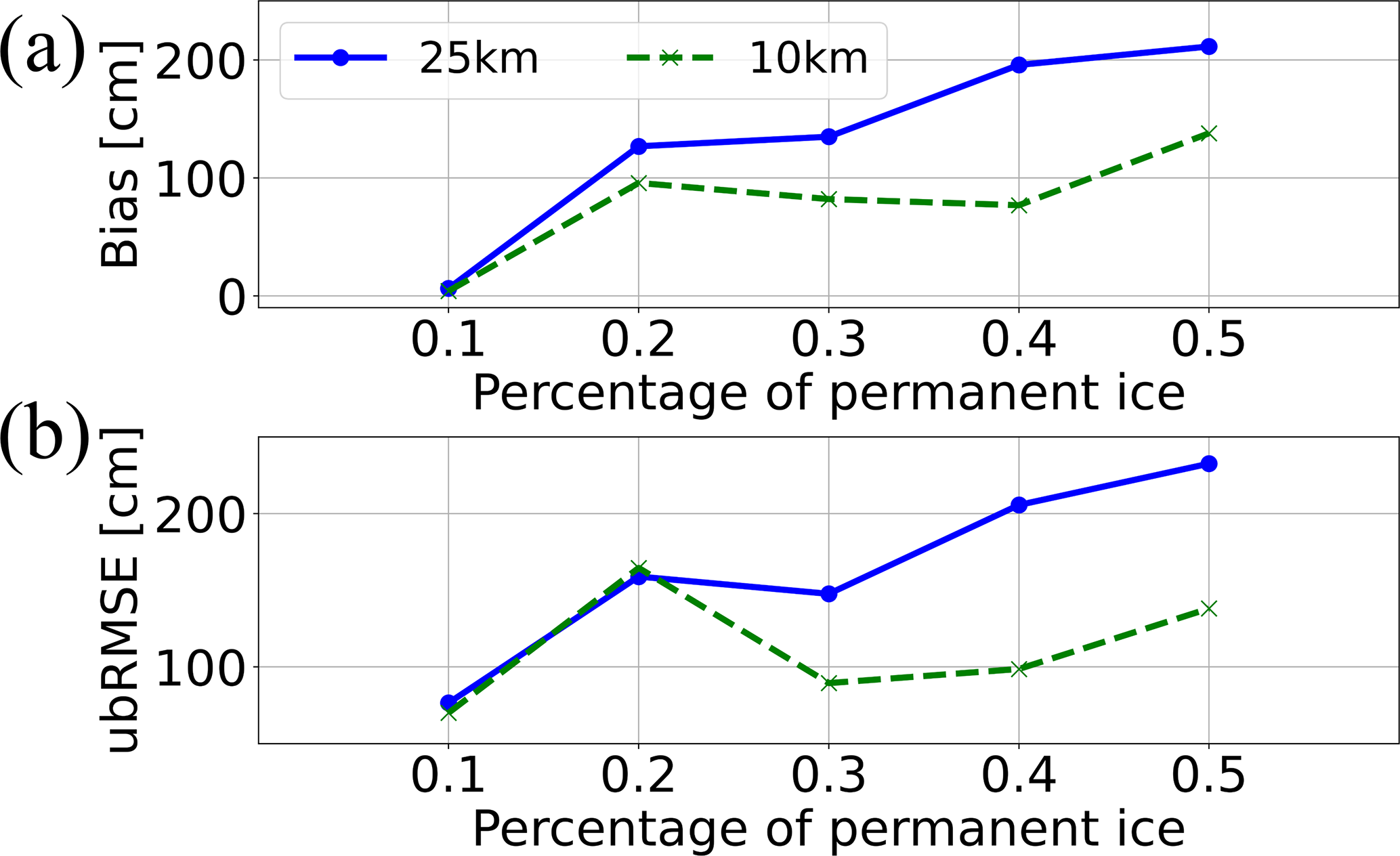 The presence of permanent ice results in large errors in the accuracy of C-snow at different scales (Fig. 10). We analyzed the errors in the C-snow product as the coverage of permanent ice within the grids increased at the 10 and 25 km scales (Fig. 11). With increasing permanent ice coverage, the bias gradually increases at both the 10 and 25 km scales, clearly indicating an overestimation trend (Fig. 11a). Moreover, the ubRMSE also tends to increase from 70.08 to 232.51 cm, indicating high uncertainty due to the presence of permanent ice (Fig. 11b).