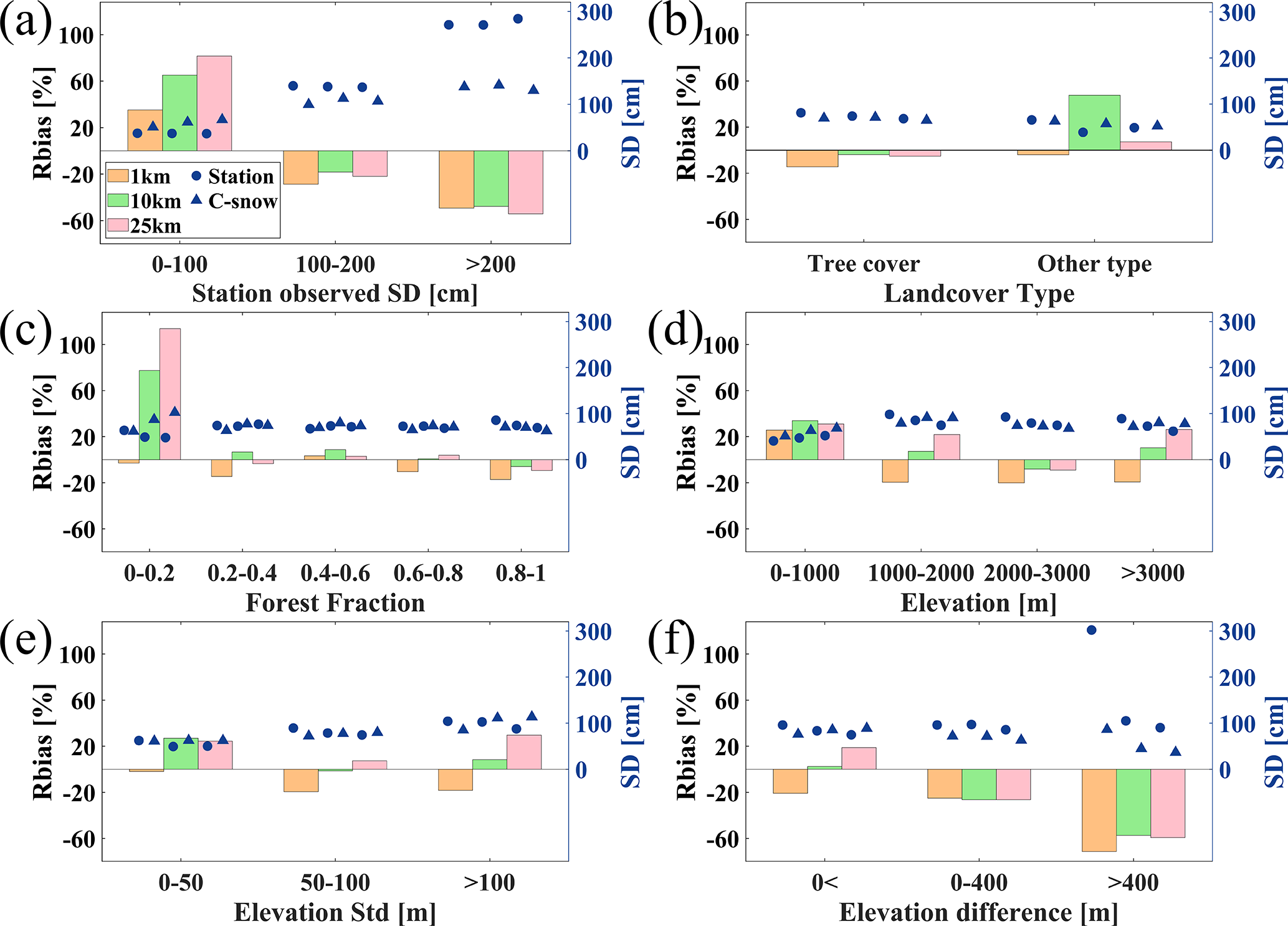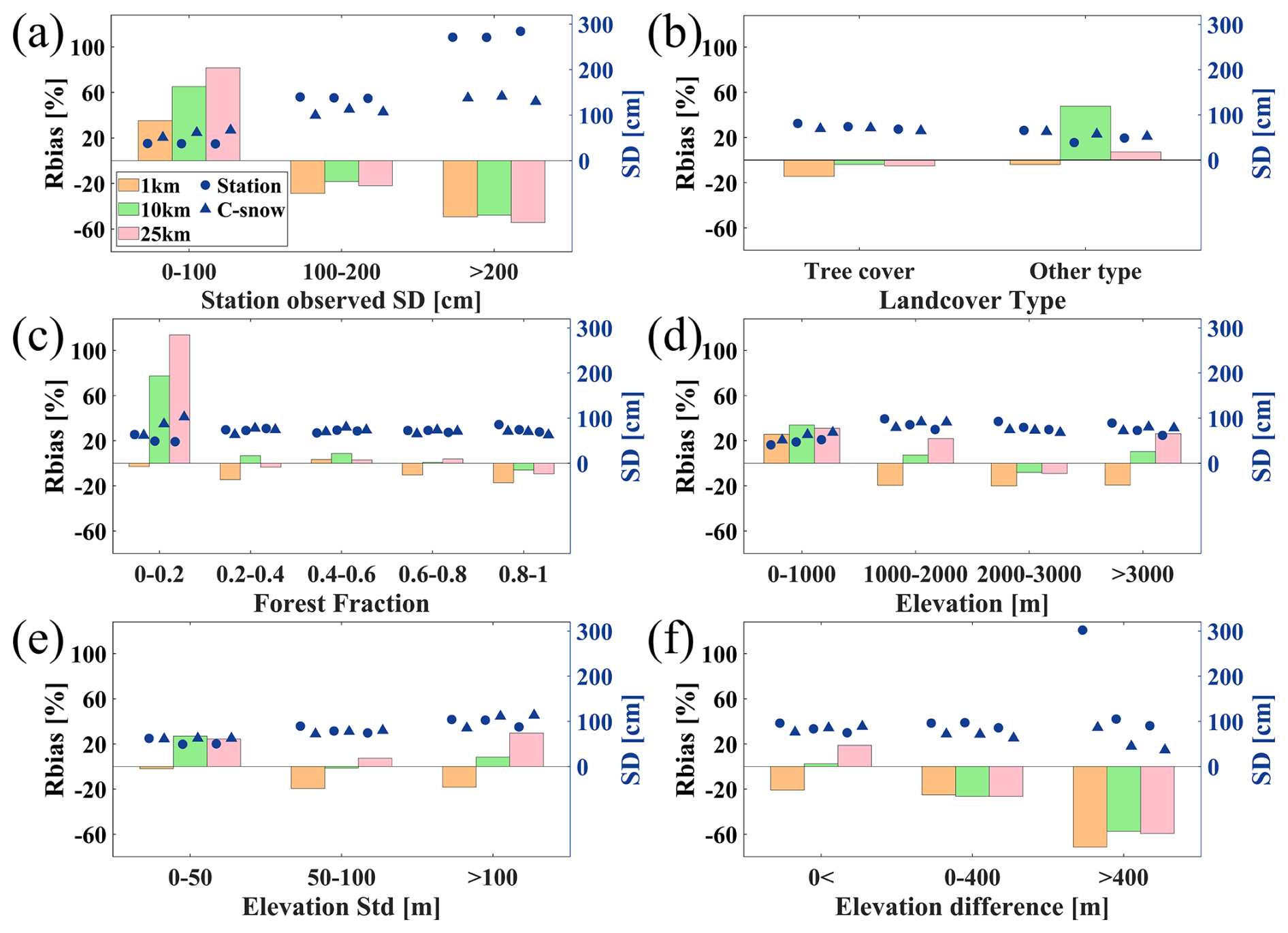 Figure 12Impact of different (a) station-observed SD, (b) land cover types, (c) forest fractions, (d) elevations, (e) standard deviations of elevation, and (f) elevation differences between stations and grids on the accuracy of C-snow SD products across various scales. The bars indicate the Rbias between the C-snow and station-observed snow SD, while the markers show the average SD from the stations and the C-snow product. The left axis corresponds to Rbias, and the right axis corresponds to the average SD.
