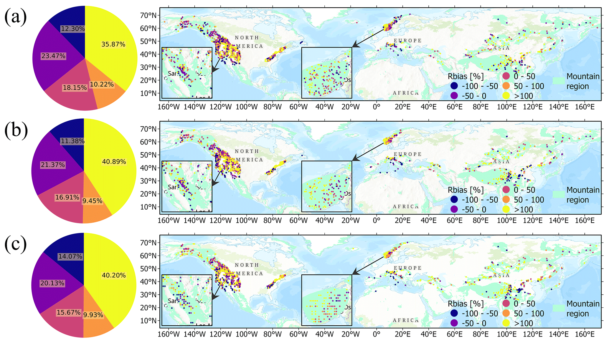 Figure 13 shows the spatial distributions of Rbias at different scales. A total of 35.77 % of the grids with Rbias values lower than 0 are underestimated at the 1 km scale, and 35.87 % of the grids with Rbias values greater than 100 % are significantly overestimated, especially in the western mountain ranges of the US, the Appalachian Mountains, the southern part of the Scandinavian Mountains, the European Alps, and the Hindu–Kush Himalayas. Moreover, this trend becomes more pronounced with increasing scale, with Rbias values greater than 100 % accounting for 40.89 % and 40.20 % of all the values at the 10 and 25 km scales, respectively.
