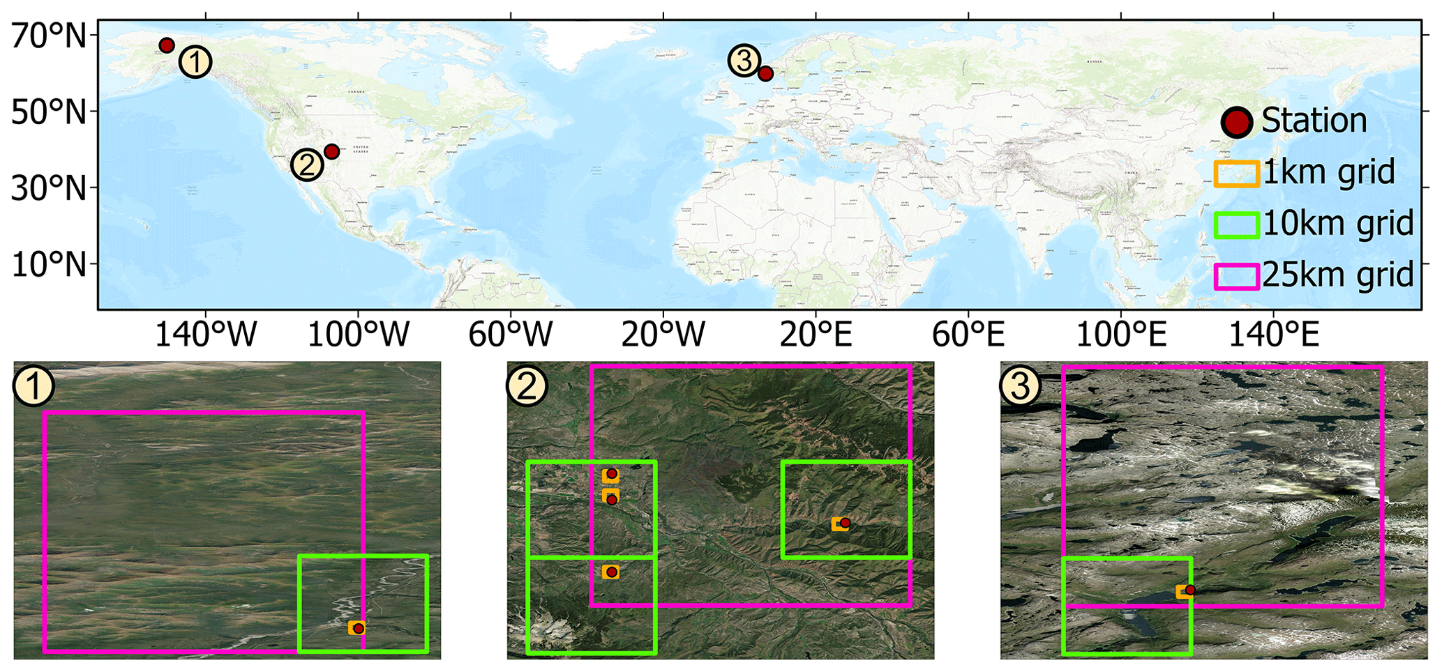 Figure 14Spatial locations of the three selected nested grids, with the first at 67.45° N, −150.31° E; the second at 39.42° N, −107.00° E; and the third at 56.00° N, 6.85° E. Basemap sources: Esri, TomTom, Garmin, FAO, NOAA, USGS, Microsoft, Vantor.