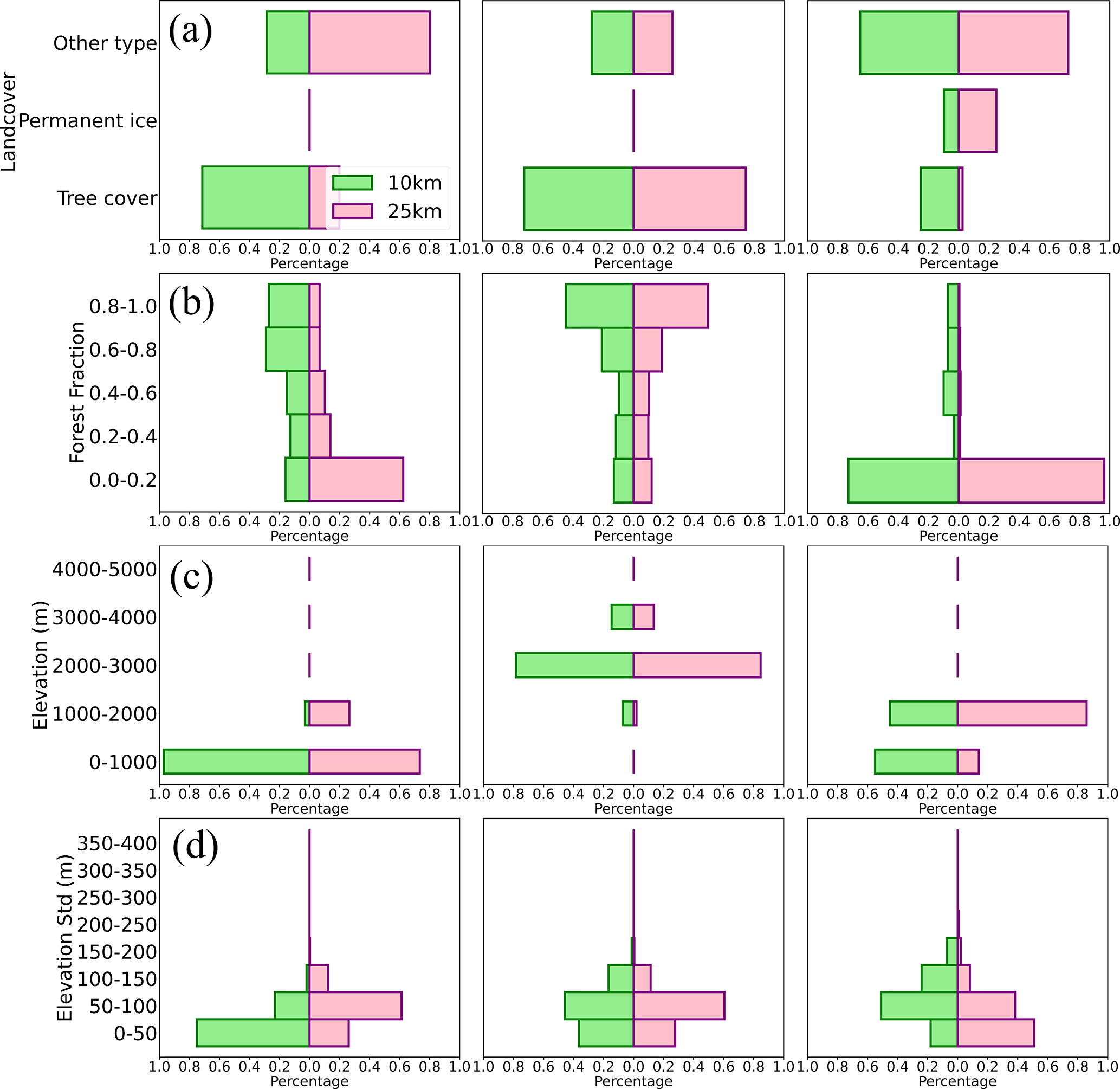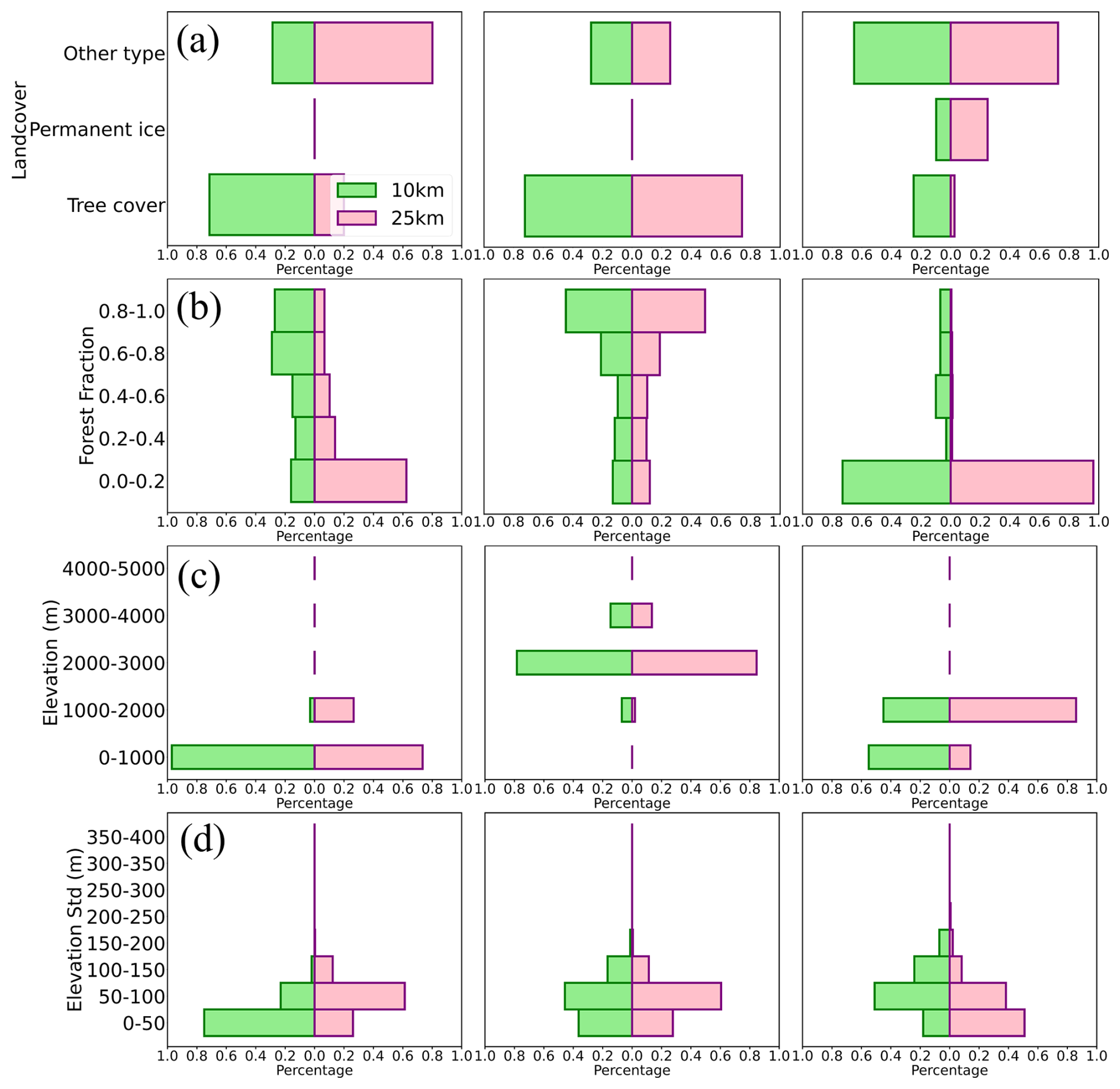 Figure 16Distributions of (a) land cover types, (b) forest fraction, (c) elevation, and (d) standard deviation of elevation in three selected nested grids, with the left, middle, and right columns representing the first, middle, and third grids, respectively.