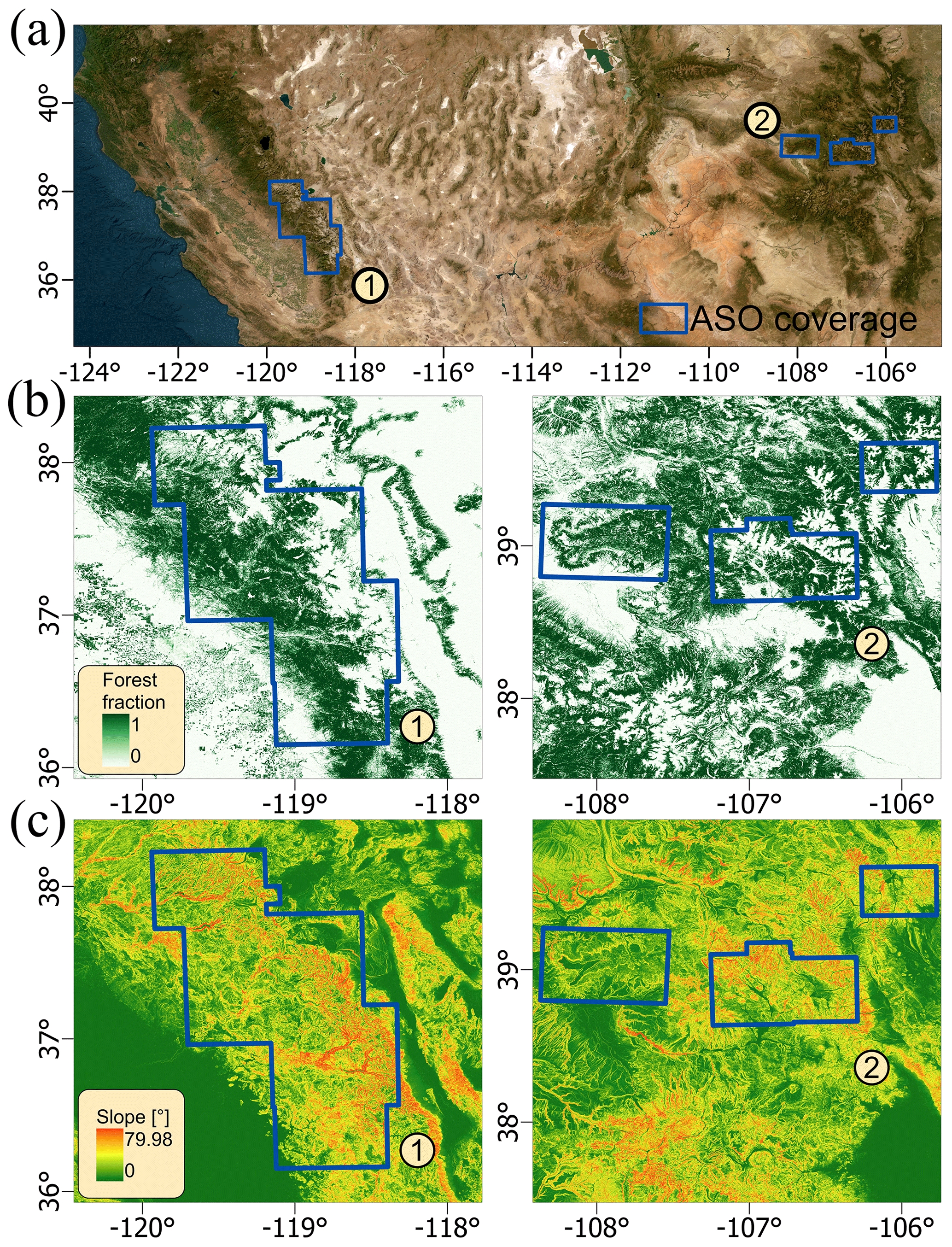 Compared with that of the station data, the accuracy of the C-snow data tends to decrease as the scale increases, whereas the accuracy of the ASO data tends to increase. This discrepancy can be attributed to the inherent differences in the nature of these validation datasets (Fig. 8). Station measurements are point-scale observations, which makes it difficult to reflect the distribution of SD over large areas. In contrast, ASO provides dense sampling data, which can better represent the spatial distribution of SD. This allows ASO data to more accurately reflect the overall snow conditions within a given area, thereby improving the validation accuracy as the scale increases. Although ASO data have better spatial continuity, their coverage is relatively limited. The accuracy of LiDAR-derived SD is also affected by factors such as terrain and vegetation cover (Enderlin et al., 2022; Neuenschwander et al., 2020; Klápště et al., 2020). Within the coverage scope of the ASO data, steep slopes (as high as 80°) and high forest fractions (mean value of 53 %) likely affect the accuracy of the observations (Fig. A1).