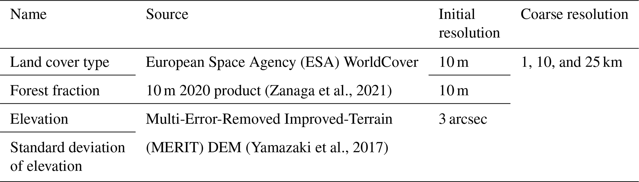 To match the scales of the C-snow SD data, we resampled the auxiliary data accordingly. The land cover type data were first resampled to a 1 km resolution via the mode resampling method. These 1 km land cover data were subsequently further resampled to 10 and 25 km resolutions. During the resampling process, if a certain land cover type occupied 80 % or more of a large grid of 10 or 25 km, that type was then assigned to the resampled grid; otherwise, no land cover type was assigned. The forest fraction, elevation, and standard deviation of the elevation at a 1 km resolution were resampled to 10 and 25 km resolutions via the average resampling method.