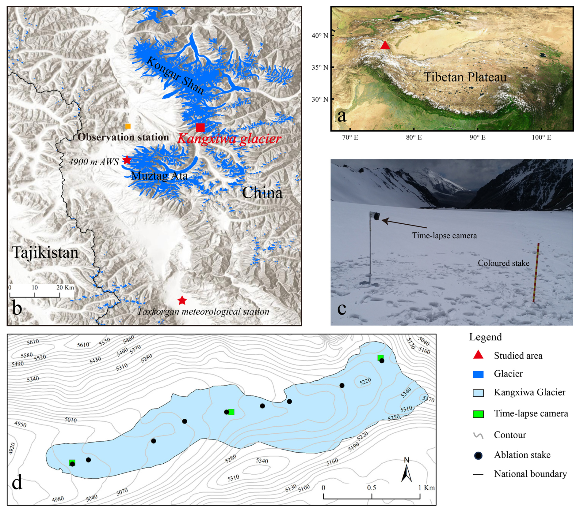Figure 1Study region and the distribution of in-situ measurements. (a) Location of the studied area in the eastern Pamir, Central Asia; (b) the location of Kangxiwa Glacier (red square), Automatic Weather Station (AWS) at the elevation of 4900 m and Taxkorgan meteorologic station (red stars); the background is from World hillshade layer (http://www.arcgis.com, last access: 10 September 2025) and the glacier outline was obtained from the Randolph Glacier Inventory (RGI 7.0); (c) photograph of the time-lapse camera and colour-coded stake on the Kangxiwa Glacier at 5300 m a.s.l. (20 June 2020); (d) topographic map of the Kangxiwa Glacier showing the locations of three time-lapse camera monitoring systems and the ablation stakes for in-situ surface mass balance observations.