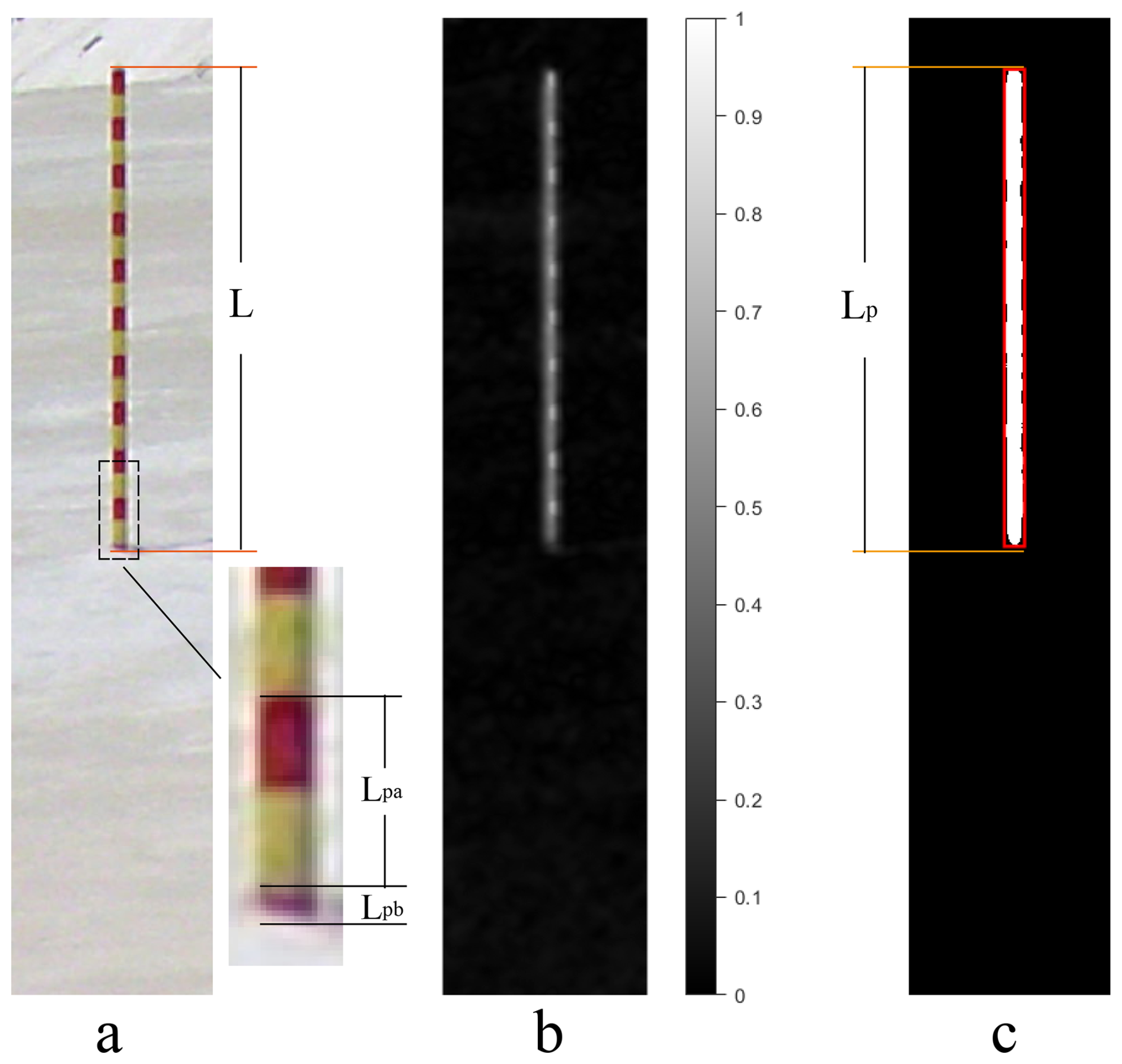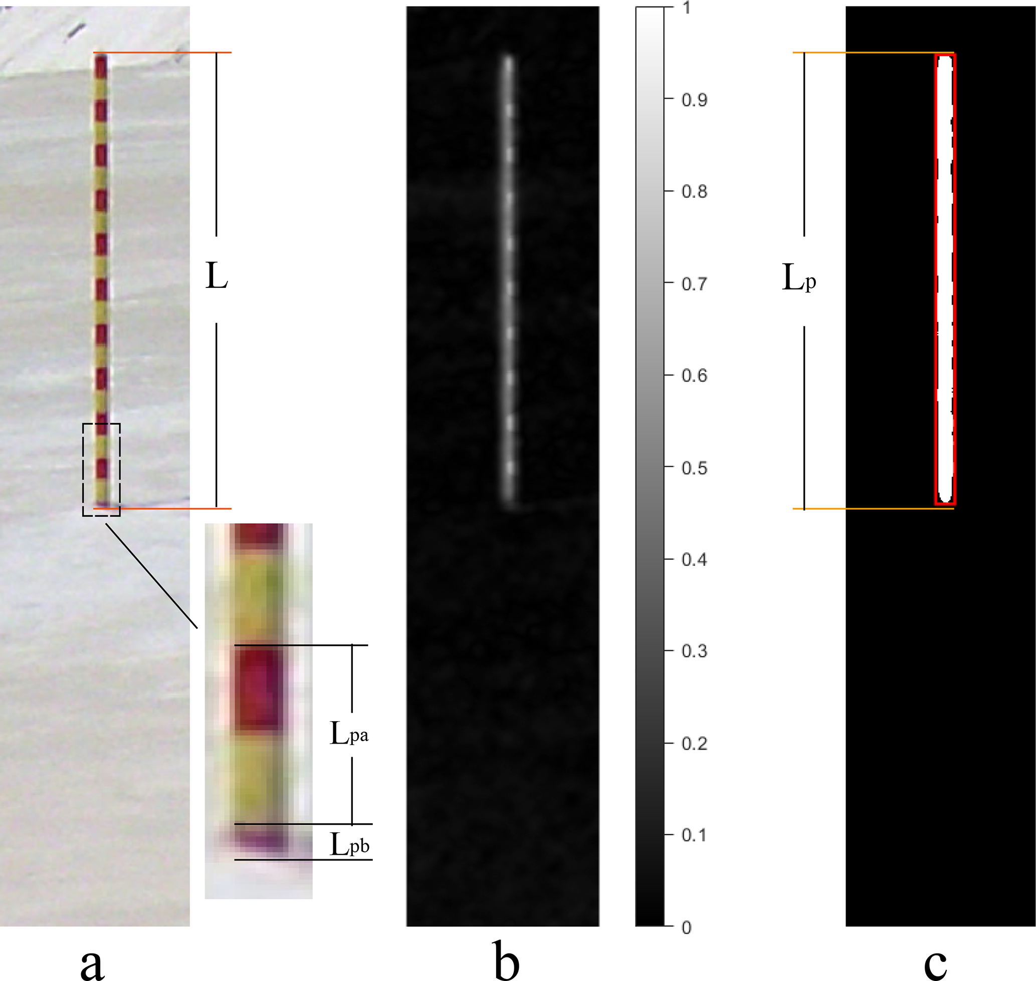 Figure 2Illustration of image processing workflow. (a) Original image with a frame and a zoomed inset of the coloured stake bottom. (b) Grayscale representation of the S channel from the HSV colour space; (c) calibration stake contour with a red minimum bounding rectangle.