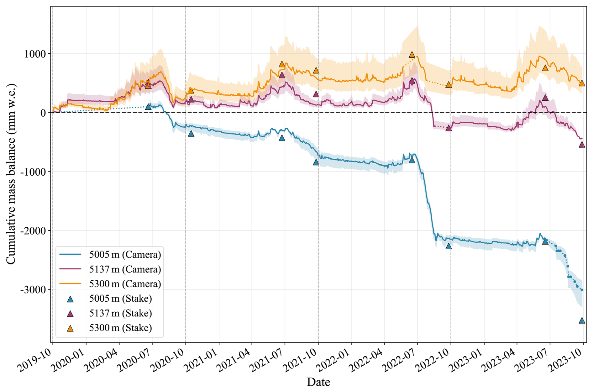 Meanwhile, linear altitudinal interpolation of two complementary datasets – camera-based point mass balances from three elevations and stake – based measurement from 9 ablation stakes – allowed for the quantification of the equilibrium line altitude (ELA) over the study period. The ELAs displayed significant interannual fluctuations: the highest ELA surpassed the glacier summit during 2021/2022 balance year, whereas the lowest ELA (5079–5086 m a.s.l.) occurred in 2019/2020.